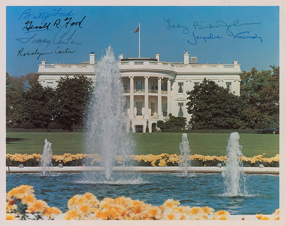 Color glossy 10 x 8 photo of the south lawn of the White House, signed in blue and black ink by Jacqueline Kennedy, Lady Bird Johnson, Gerald and Betty Ford, and Jimmy and Rosalynn Carter. In fine condition. Pre-certified PSA/DNA.