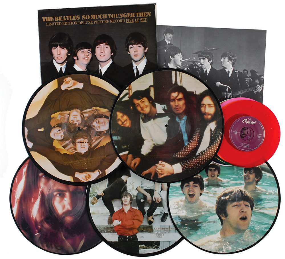 So Much Younger Then limited edition box set from the Beatles, 12.25 x 12.5 x 1, containing five picture discs, a four-page copy of the BBC transcription services disc jockey notes, and an unsigned photo of the Fab Four. The records are separated into three parts: Beatles BBC Session—The Beatles at the Beeb, Five Nights in a Judo Arena, and Watching Rainbows. In fine condition, with some cracking to the images on both sides of the first disc and light wear to corners of the box set. Accompanied by a multi-colored set of fifteen Capitol Records 45 rpm jukebox singles by the Beatles, each in their original white paper sleeve, including: ‘She Loves You / I’ll Get You,’ ‘There’s a Place / Twist and Shout,’ and ‘Strawberry Fields Forever / Penny Lane.’