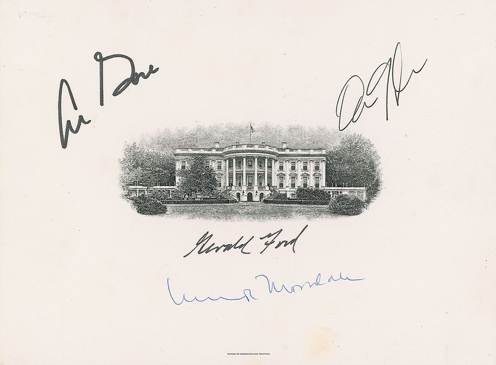 Engraved portrait of the exterior of the White House, 8 x 6, signed around the image in black ink by Gerald Ford, Dan Quayle, and Al Gore, and in blue ballpoint by Walter Mondale. In fine condition, with a light spot of toning and trivial soiling. Pre-certified PSA/DNA.