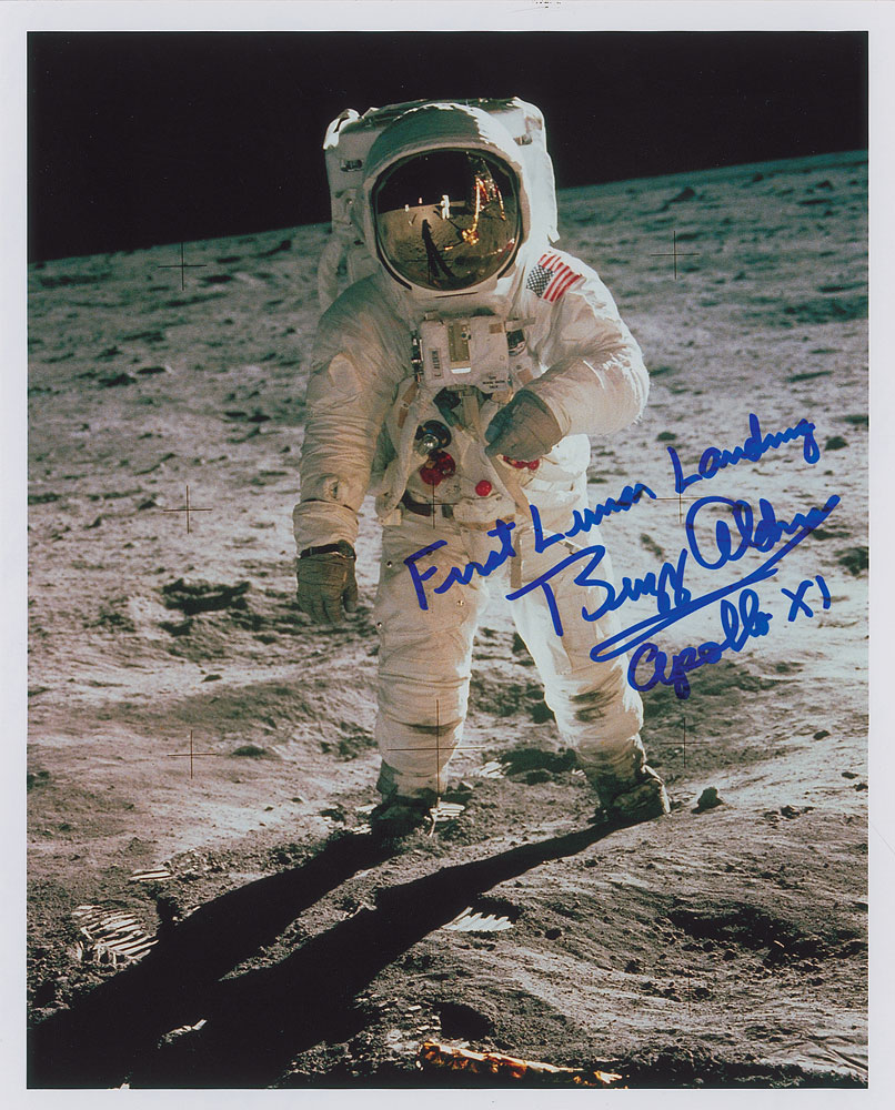Color satin-finish 8 x 10 photo of Aldrin standing on the surface of the moon, looking at the camera, signed in blue felt tip, “First Lunar Landing, Buzz Aldrin, Apollo XI.” In very fine condition. Pre-certified Zarelli Space Authentication.