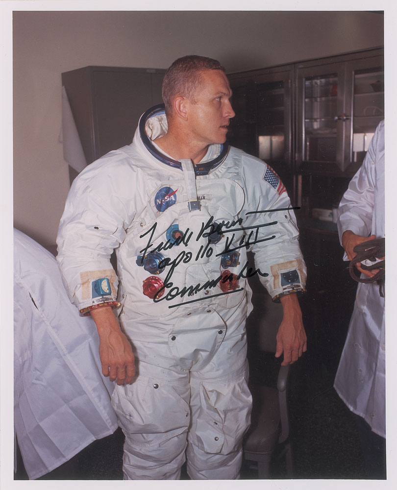 Uncommon color satin-finish 8 x 10 photo of Borman in his spacesuit, signed in black felt tip, “Frank Borman—Apollo VIII Commander.” In very fine condition. A reluctant signer, Borman is one of the most difficult Apollo autographs. The Leon Ford Collection. Pre-certified Zarelli Space Authentication.