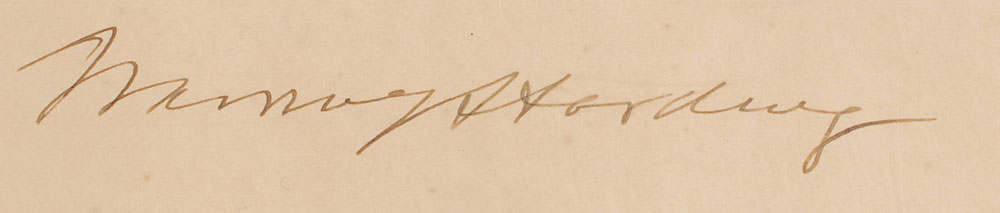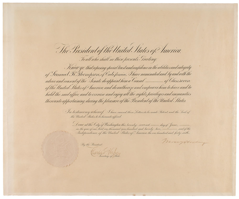 Partly-printed DS as president, one page, 23 x 19, June 22, 1922. President Harding appoints “Samuel R. Thompson, of California, a Consul of Class seven.” Nicely signed at the conclusion by President Harding and countersigned by Secretary of State Charles Evans Hughes. The crisply embossed white paper seal affixed to the lower left remains fully intact. Tightly rolled and in fine condition, with uniform toning and a few creases. Pre-certified PSA/DNA.