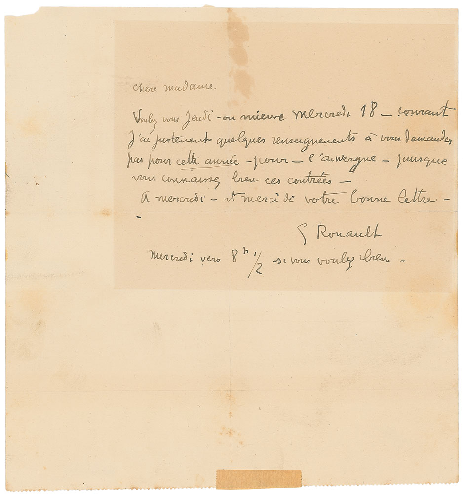 French Fauvist and Expressionist painter, and printmaker in lithography and etching (1871–1958). ALS in French, signed “G. Rouault,” one page, 8.25 x 7, no date. Letter to a woman, in full (translated): “Would you like Thursday—or better this current Wednesday the 18th? I have some exact information to ask of you not for this year—for Auvergne—because you know these districts best. Until Wednesday—and thank you for your nice letter.” In very good to fine condition, with central vertical and horizontal folds (a partial separation to right edge), a block of uniform toning, and some spots of discoloration and toning. Accompanied by an unsigned photo of the artist. Pre-certified PSA/DNA.