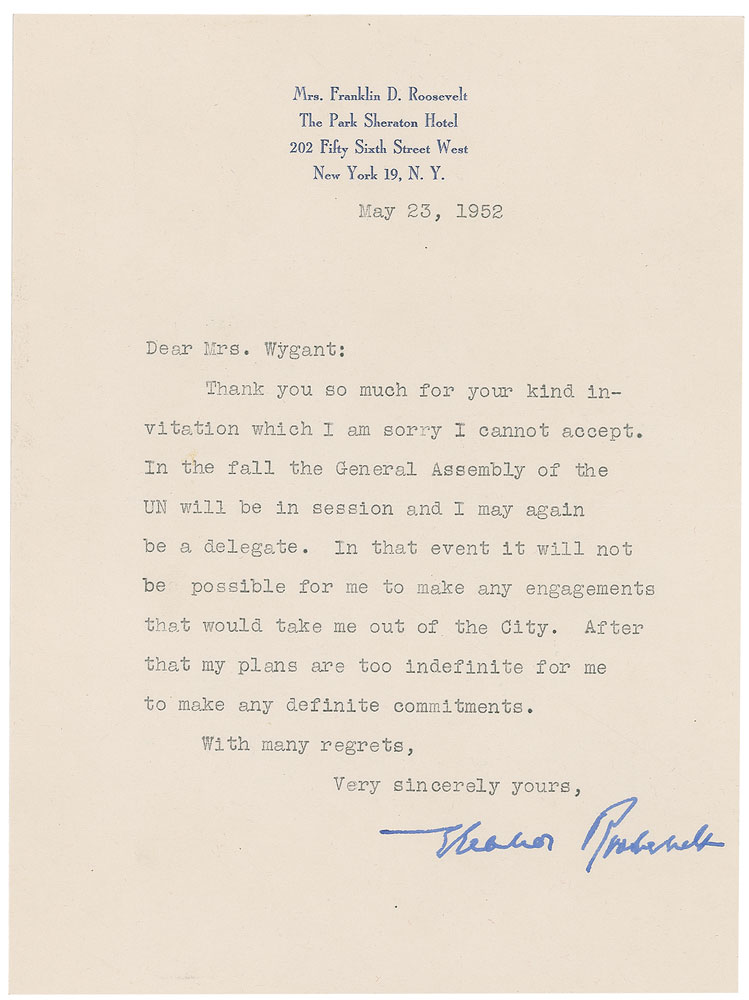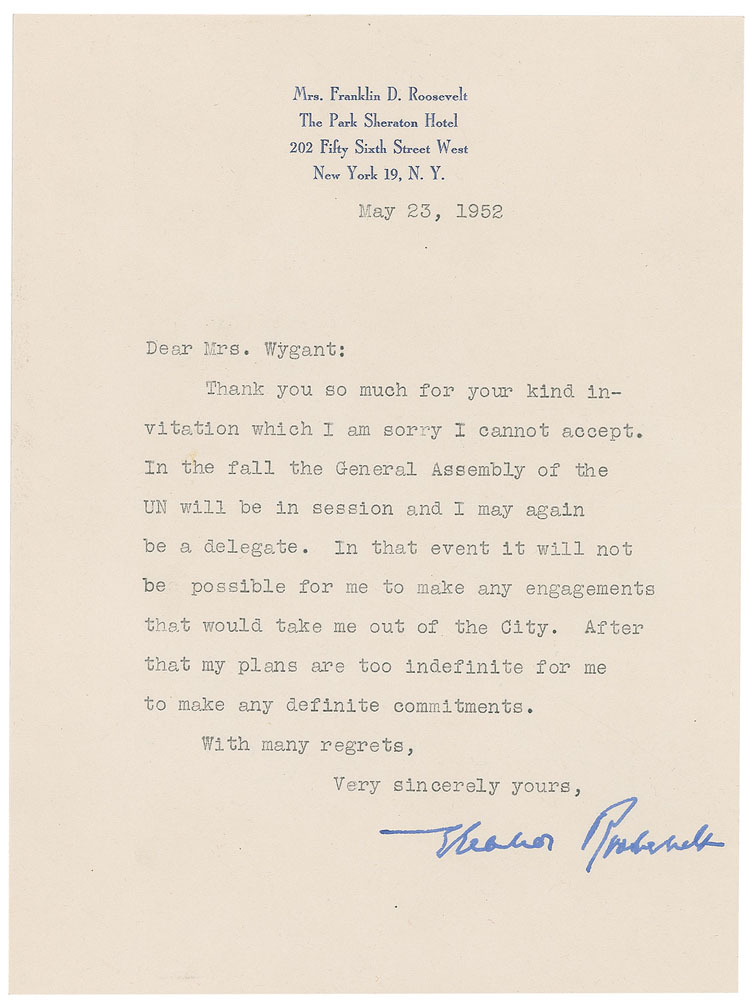 TLS, one page, 6 x 8.25, personal letterhead, May 23, 1952. Letter to Mrs. Wygant, in full: “Thank you so much for your kind invitation which I am sorry I cannot accept. In the fall the General Assembly of the UN will be in session and I may again be a delegate. In that event it will not be possible for me to make any engagements that would take me out of the city. After that my plans are too indefinite for me to make any definite commitments.” In fine condition. Pre-certified PSA/DNA.