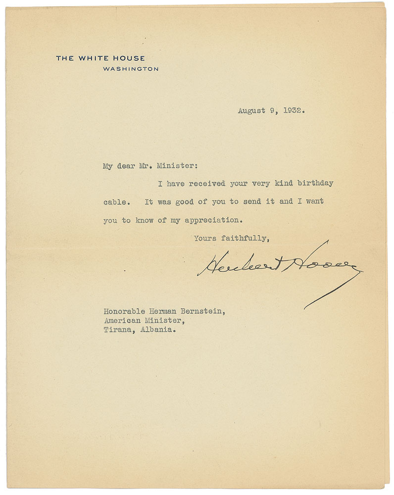 TLS as president, one page, 7 x 9, White House letterhead, August 9, 1932. Letter to Herman Bernstein, in full: “I have received your very kind birthday cable. It was good of you to send it and I want you to know of my appreciation.” Original mailing envelope is affixed to the second integral page. In fine condition. Two years after publishing Herbert Hoover: The Man Who Brought America to the World, Bernstein was appointed as the United States minister to Albania by President Hoover in 1930. Pre-certified PSA/DNA.