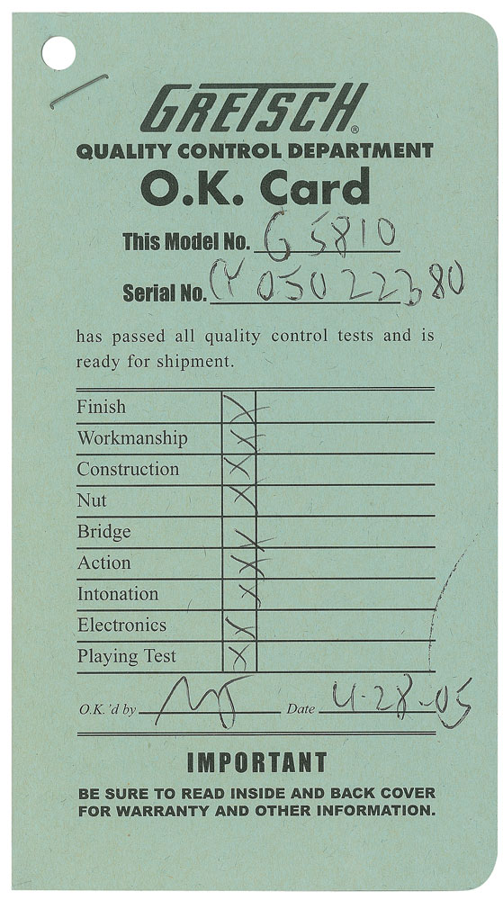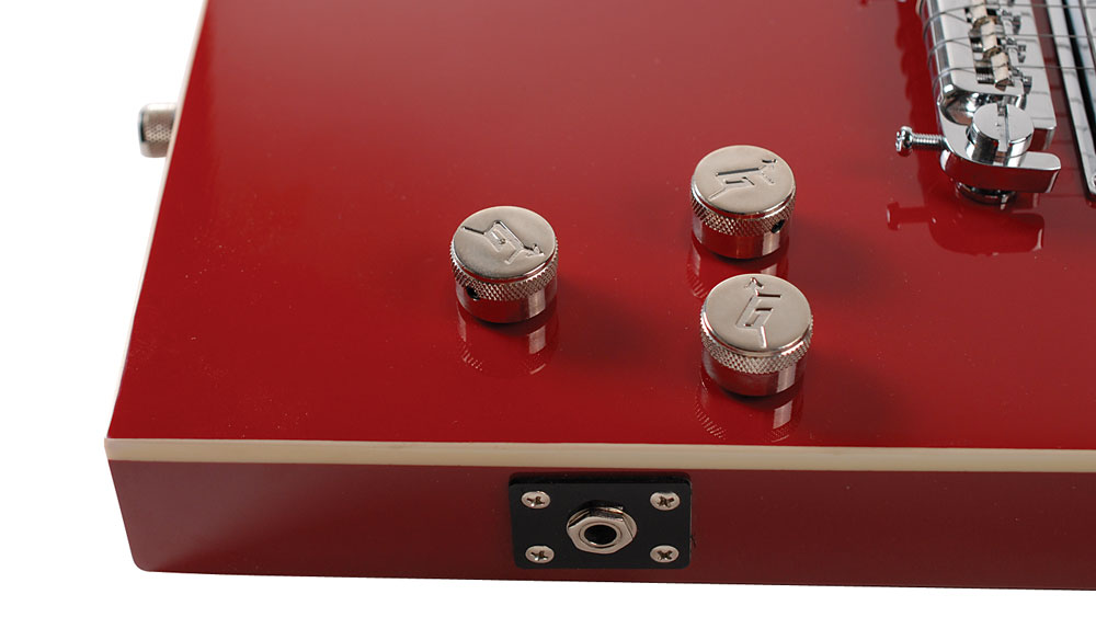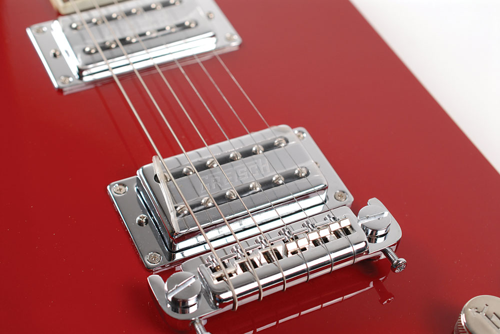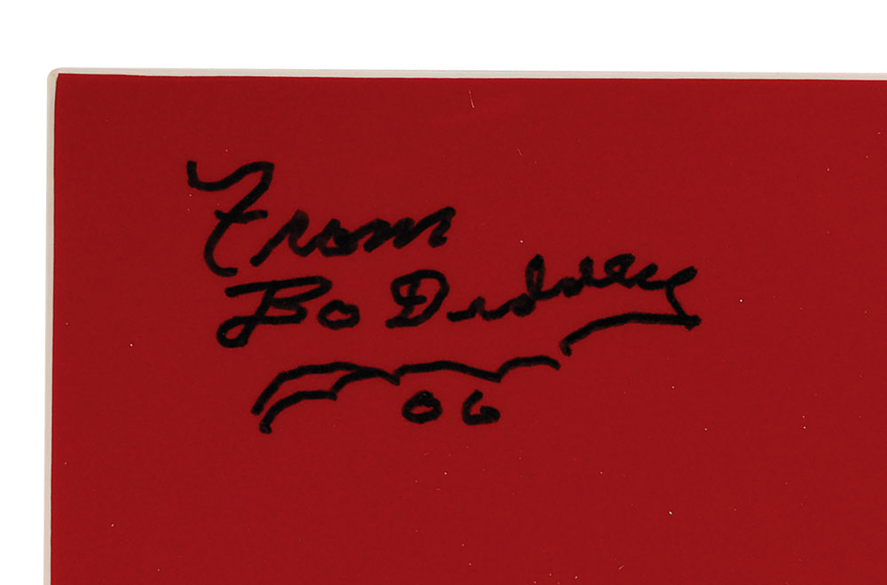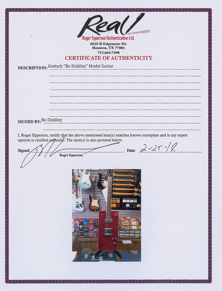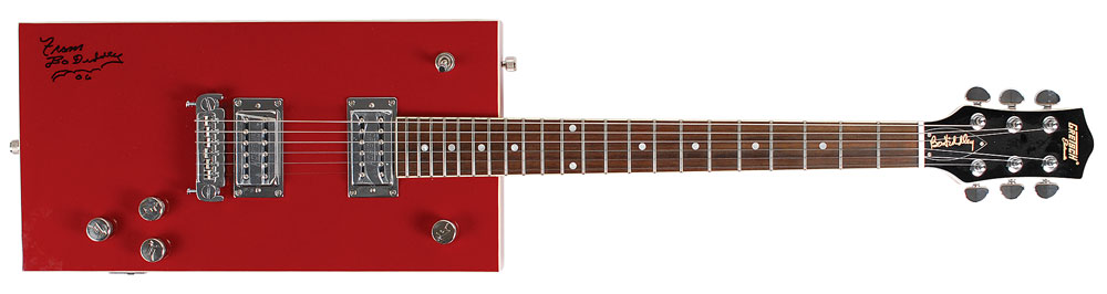 Red Gretsch Electromatic Bo Diddley Model ‘cigar box’ electric guitar, signed on the body in black felt tip, “From Bo Diddley, 06.” In fine condition. Accompanied by a full letter of authenticity from REAL. Consignor notes that the signature was obtained in 2006 at the Showcase Music & Sound, while Diddley was playing at the Aladdin Theatre in Portland Oregon. Based on the homemade guitars Diddley fashioned from old cigar boxes, this striking instrument recalls the simplistic yet undeniable style of a true rock and roll originator. Oversized.