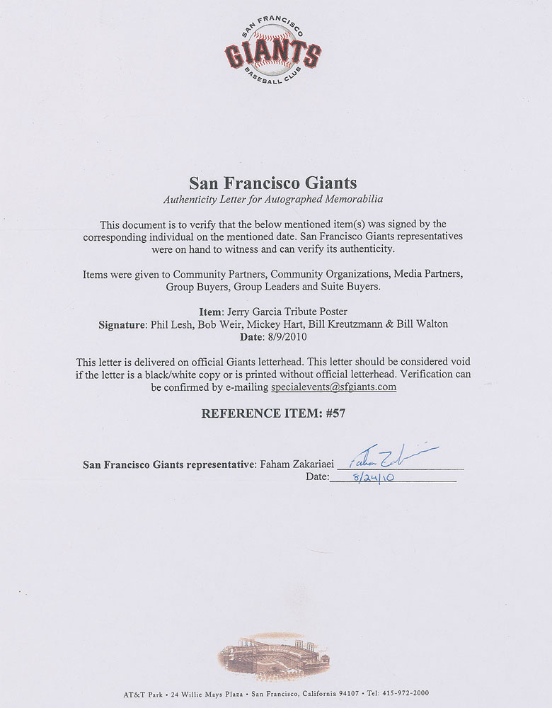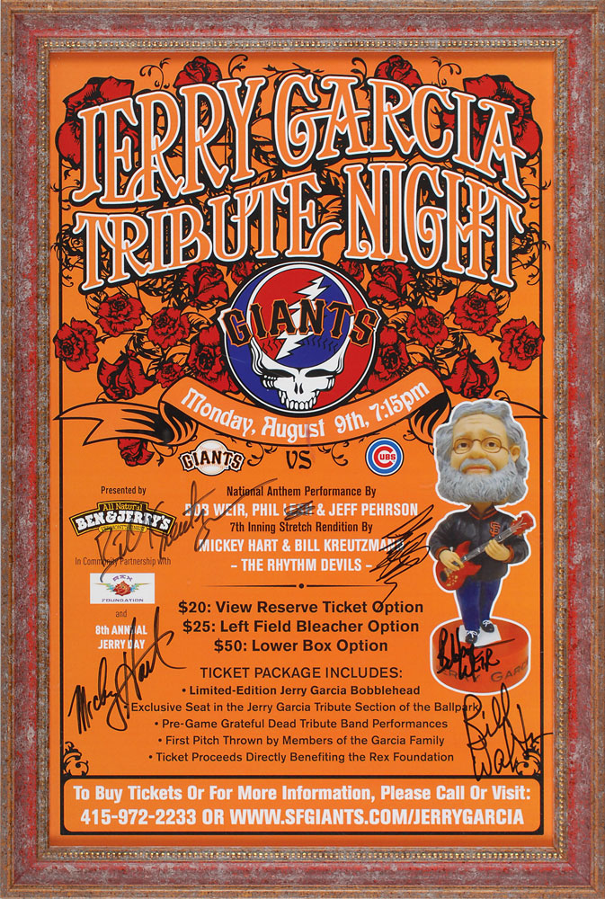 Collection of items commemorating Jerry Garcia Tribute Night during a San Francisco Giants and Chicago Cubs baseball game at AT&T Park on August 9, 2010, including: a wonderful Jerry Garcia Tribute Night poster, 10.5 x 16.5, featuring the iconic lightning-skull logo emblazoned with the Giants team name, a Jerry Garcia bobblehead figurine, and further game and ticket information, signed in black felt tip by Bob Weir, Phil Lesh, Mickey Hart, Bill Kreutzmann, and NBA hall of famer Bill Walton, with Lesh’s last name crossed out by an unknown hand; the aforementioned Ben & Jerry’s bobblehead, 3 x 8, given to special event ticket holders, and portraying Garcia’s National Anthem performance at Candlestick Park in 1993, signed on the presentation box in black felt tip by Walton and one other; and an orange kazoo and used game ticket from that night. The poster is framed to an overall size of 12.5 x 18.25. In overall fine condition. Accompanied by a full letter of authenticity from the San Francisco Giants organization. Pre-certified REAL.