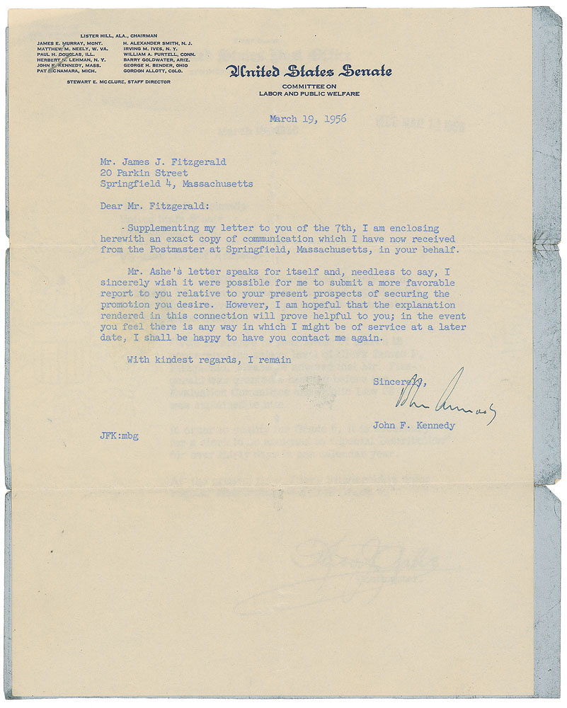 TLS, one page, 8 x 10.5, United States Senate letterhead, March 19, 1956. Letter to James J. Fitzgerald in Springfield, Massachusetts. In part: “I am enclosing herewith an exact copy of communication which I have now received from the Postmaster at Springfield…Mr. Ashe’s letter speaks for itself and, needless to say, I sincerely wish it were possible for me to submit a more favorable report to you relative to your present prospects of securing the promotion you desire.” The copied letter Kennedy references is stapled to the upper left. In fine condition, with intersecting folds, light soiling, and a partial separation to the attached mimeographed letter. Pre-certified PSA/DNA.
