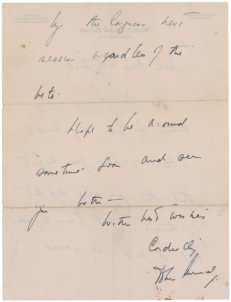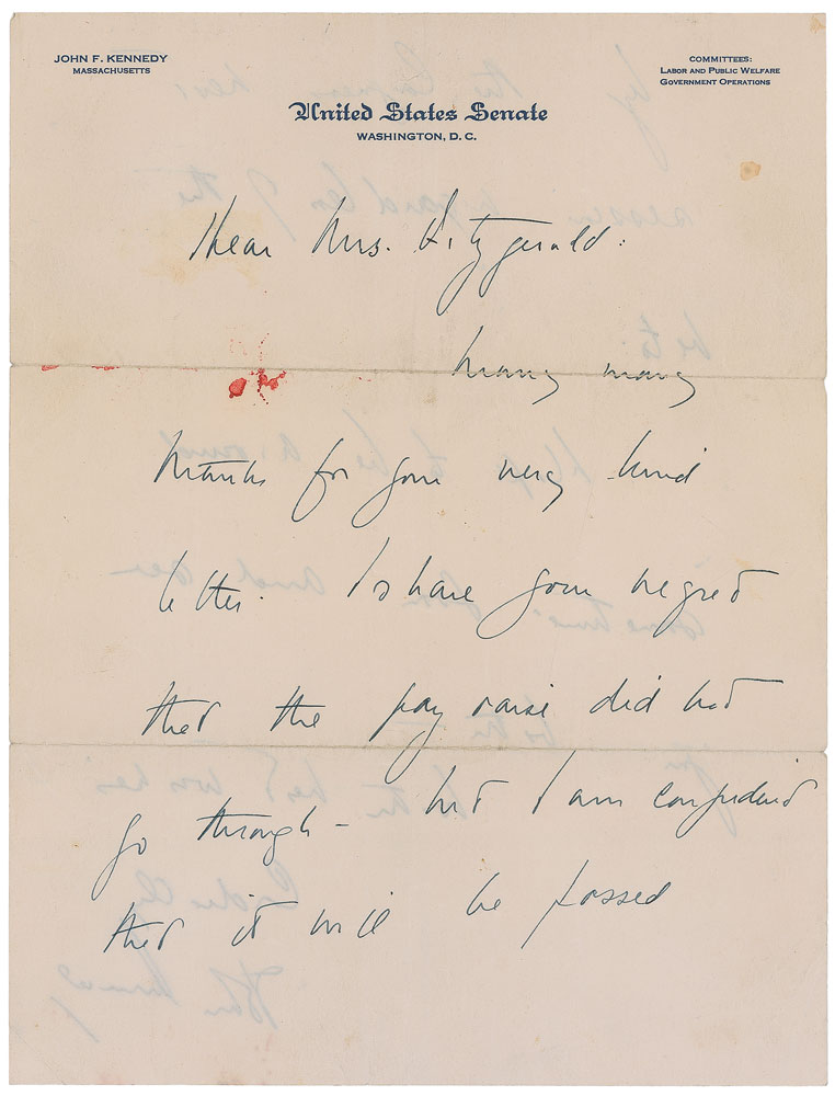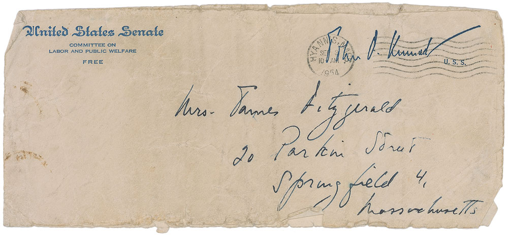 ALS signed “John Kennedy,” one page both sides, 8 x 10.5, United States Senate letterhead, September 2, 1954. Letter to Mrs. James Fitzgerald in Springfield, Massachusetts. In full: “Many many thanks for your very kind letter. I share your regret that the pay raise did not go through—but I am confident that it will be passed by the Congress next session regardless of the veto. Hope to be around sometime soon and see you both.” In very good condition, with heavy horizontal mailing folds, several lighter vertical folds, some scattered stray red ink and soiling, and a small tear to the upper border. Accompanied by the original mailing envelope, addressed in his own hand. An especially interesting autographic piece as Kennedy incorporates his own seldom-seen middle name, “Fitzgerald,” in the recipient’s name at both the top of the letter and on the envelope. James Fitzgerald was a postal worker and had briefly helped campaign for JFK. At the end of its session in August 1954, Congress passed a bill to grant raises to all federal employees, including a permanent five-percent pay raise for postal workers. Eisenhower withheld his approval—a ‘pocket’ veto—chiefly because it provided no method of raising revenue to finance the cost of the pay hikes, and some saw it as retaliation after Congress had rejected his request for an increase in postal rates. A sought-after handwritten letter that holds historic, autographic, and philatelic interest. Pre-certified PSA/DNA.