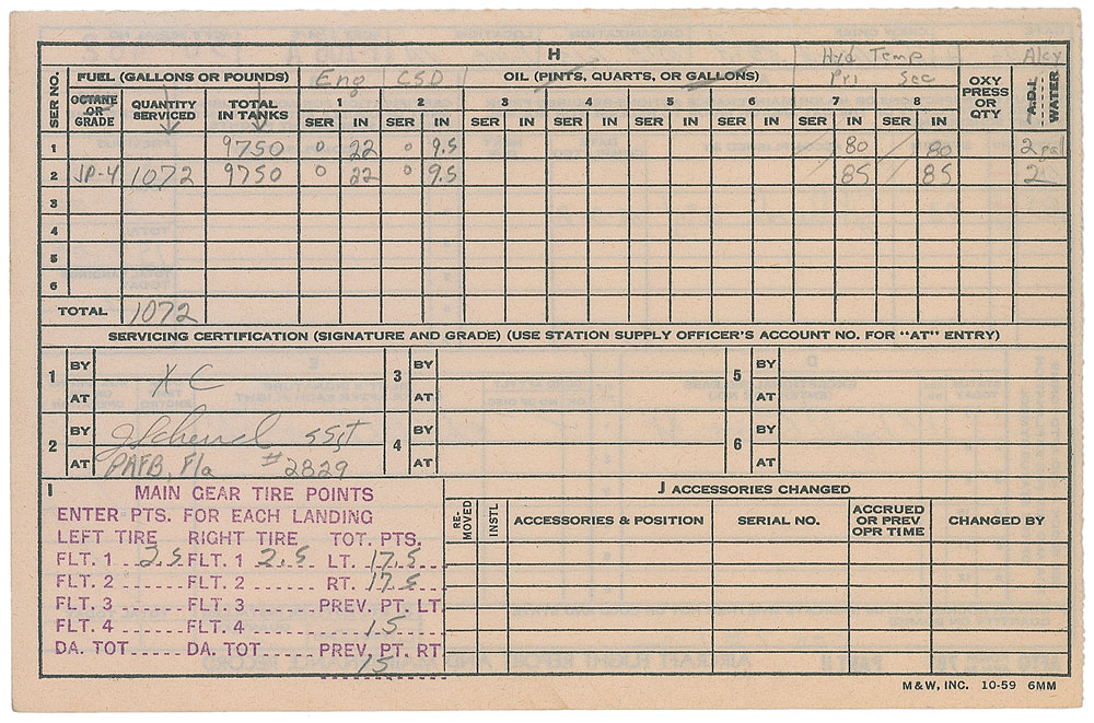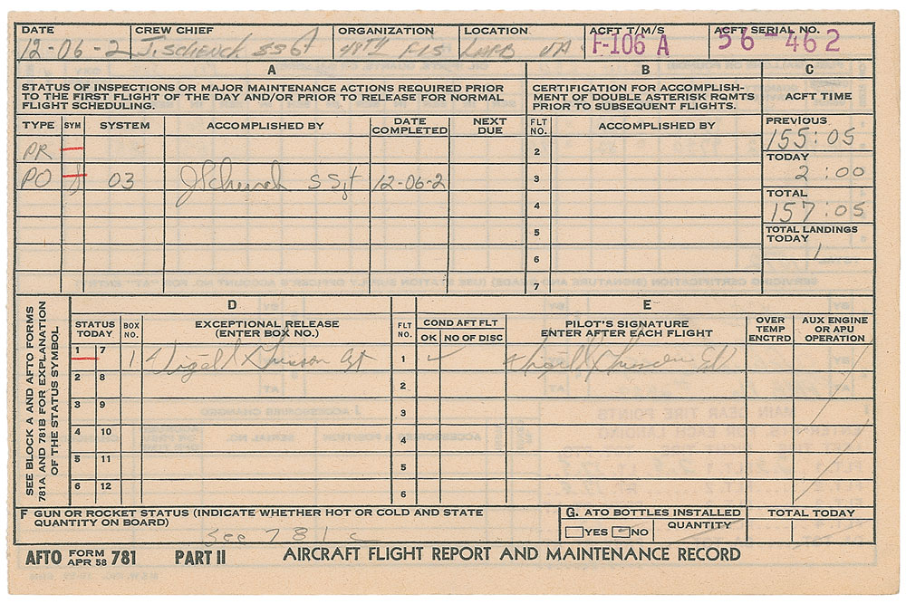 DS, signed twice in pencil, “Virgil I. Grissom,” one page both sides, 8 x 5.25, December 6, [1962]. Part two of Air Force AFTO form 781, an “Aircraft Flight Report and Maintenance Record,” filled out in another hand with information about flying an F–106 A aircraft, serial number 56–462, at Virginia’s Langley Air Force Base, listing various inspection requirements prior to initial and subsequent flights. Grissom signs twice on the front in pencil. In fine condition, with expected document wear. Pre-certified Zarelli Space Authentication.