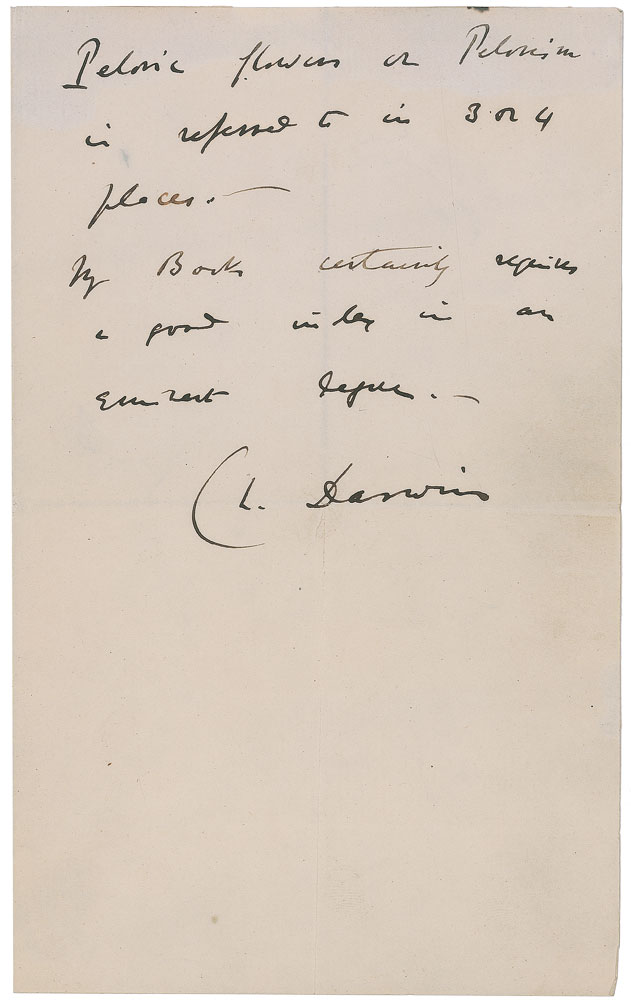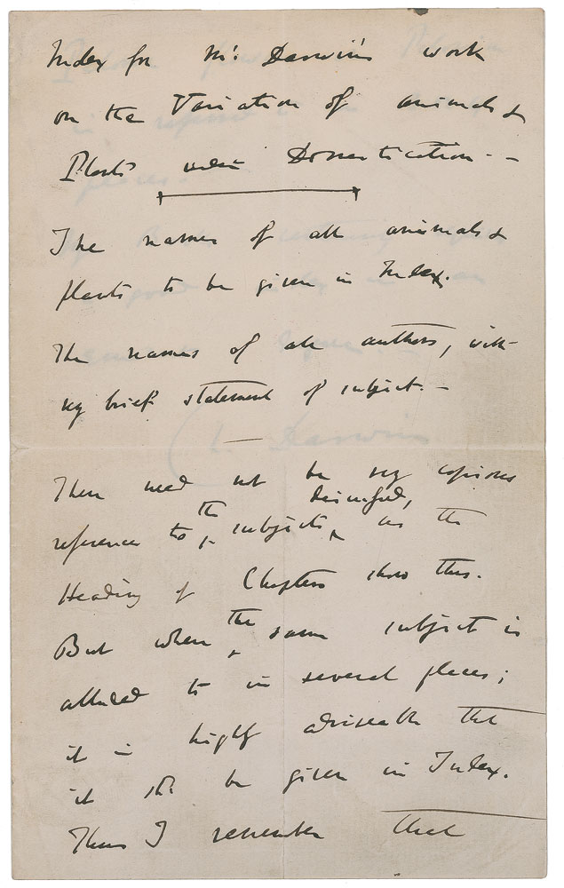 ALS signed "Ch. Darwin," two pages on two adjoining sheets, 5 x 8, no date. A memorandum headed, "Index for Mr. Darwin's work on the Variation of animals & Plants under Domestication." In full: "The names of all animals & plants to be given in Index. The names of all the authors, with very brief statement of subject-There need not be very copious references to the subjects discussed, as the Heading of Chapters show this. But when the same subject is alluded to in several places; it is highly advisable that it shd be given in Index. Thus I remember that Peloric flowers or Pelorism is referred to in 3 or 4 places. My Book certainly requires a good index in an eminent degree." In fine condition, with light central vertical and horizontal folds passing through the signature. Presented in a custom-made folder, with red silk moire boards and gilt lettering.