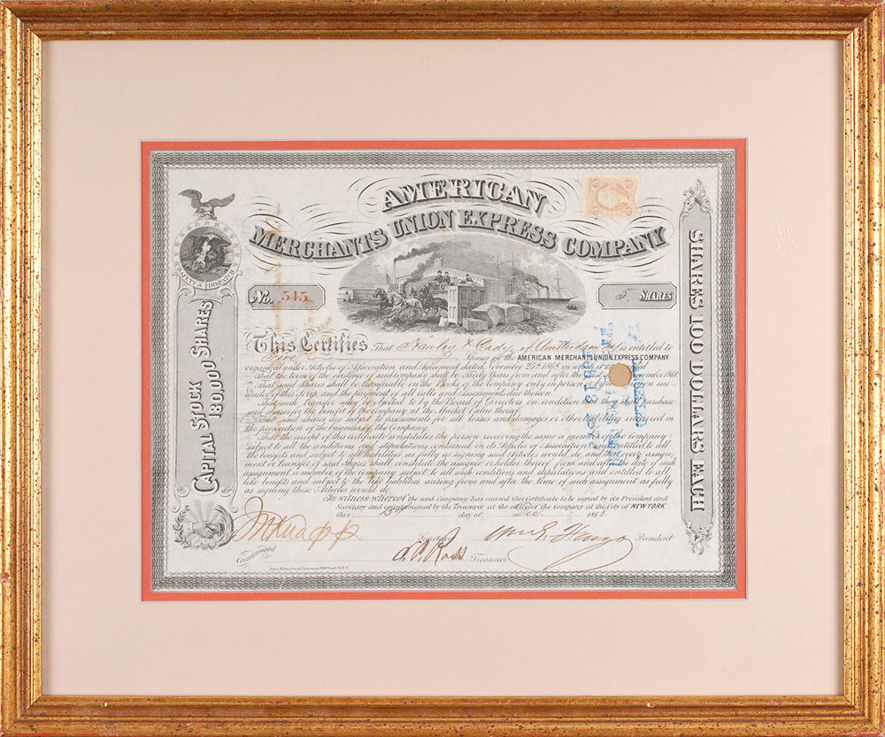 Partly-printed DS, signed “Wm. G. Fargo,” one page, 11.5 x 8.5, December 13, 1868. A certificate for five shares of stock in the American Merchants Union Express Company issued to Hawley & Cady, signed at the bottom by Wells as president of the company. Nicely double-matted and framed to an overall size of 17 x 14.5. Expected cancellation stamps and holes, and show-through from writing to reverse, otherwise fine condition. Pre-certified PSA/DNA.