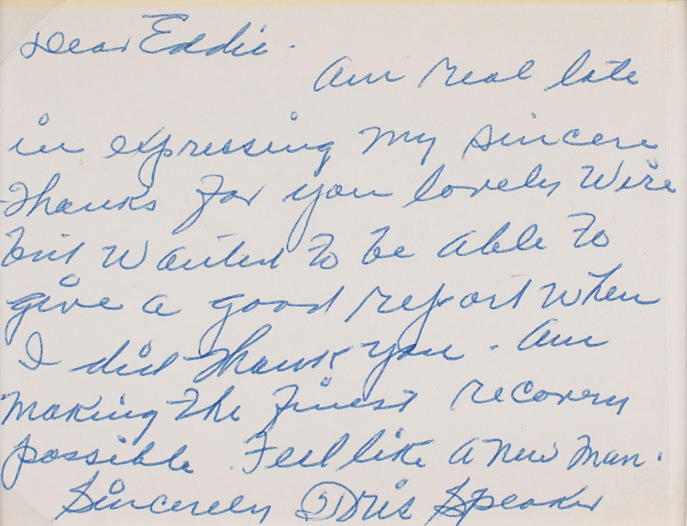 ALS, one page, 4.25 x 3.25, no date. Response to a well-wisher. In full: “Am real late in expressing my sincere thanks for your lovely wire but wanted to be able to give a good report when I did—thank you—am making the finest recovery possible. Feel like a new man.” Matted with a modern photo of Speaker to an overall size of 16 x 12. In fine condition. Accompanied by a full letter of authenticity from JSA. Pre-certified PSA/DNA.