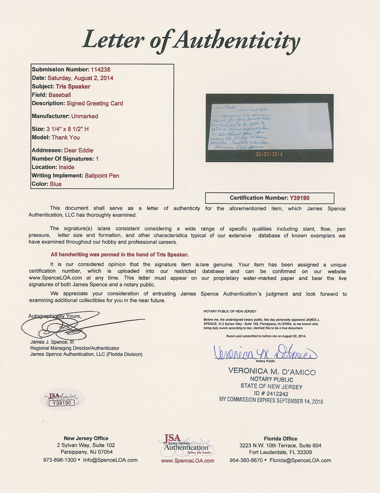 Tris Speaker Handwritten Letter Signed