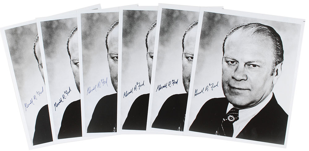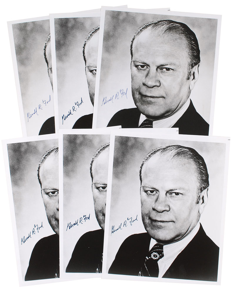 Six identical glossy 8 x 10 portraits of Ford, each signed in black felt tip, “Gerald R. Ford.” In overall very fine condition. Pre-certified PSA/DNA.