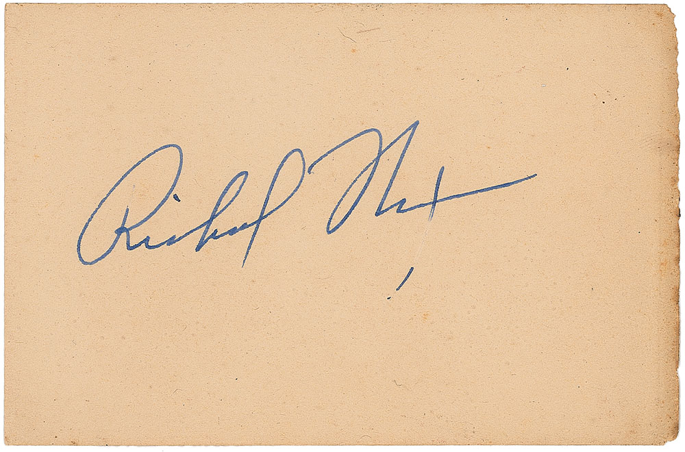 Ink signature, “Richard Nixon,” on an off-white 4.5 x 3 card. A rough and toned right edge, and skipping to last letter of the signature, otherwise fine condition. Pre-certified PSA/DNA.