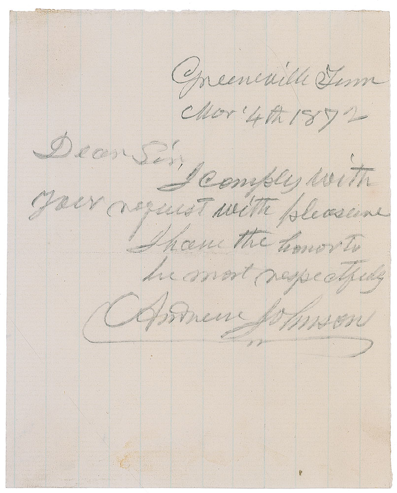 ANS in pencil, one page, lightly-lined, 4 x 5, March 4, 1872. Note to a gentleman, in full: “I comply with your request with pleasure. I have the honor to be most respectfully, Andrew Johnson.” Vertical and horizontal folds (one passing through a single letter of the signature), and some light toning from mounting remnants on reverse, otherwise fine condition. Pre-certified PSA/DNA.