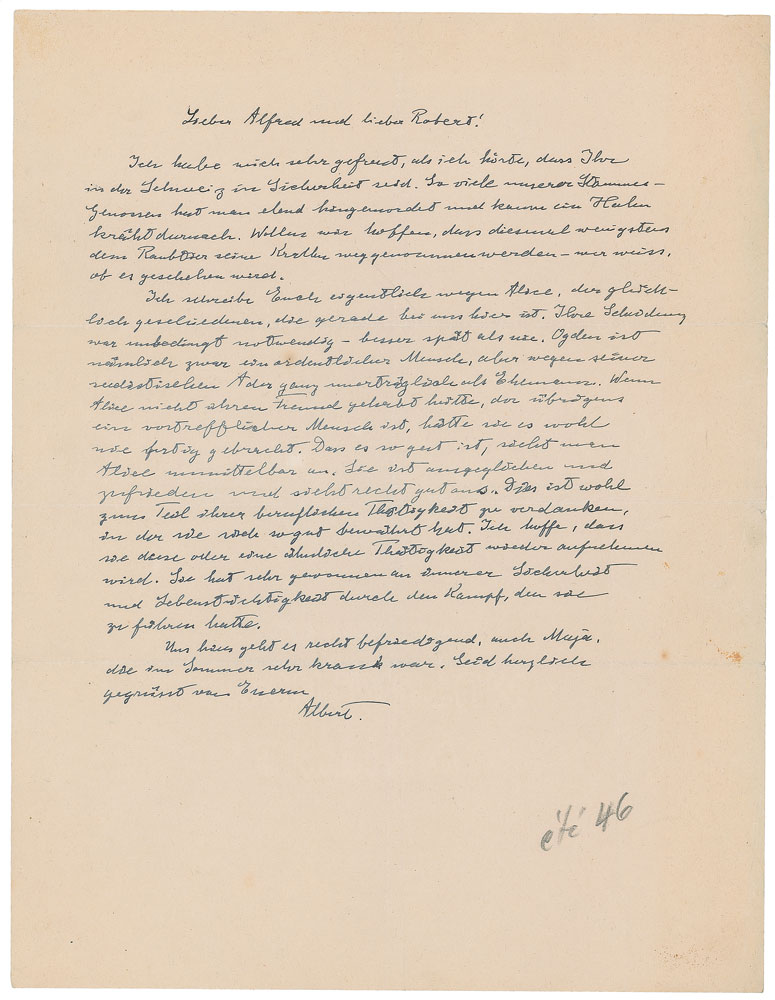 ALS in German, signed “Albert,” one page, 8.5 x 11, no date but circa summer 1946. Letter to his cousins Alfred and Robert. In full (translated): "I was delighted to hear that you both are safely in Switzerland. So many of our tribesmen were ruthlessly murdered and nobody gave a damn. Let’s hope that this time the claws shall be cut off from this predator—who knows if indeed it will happen.