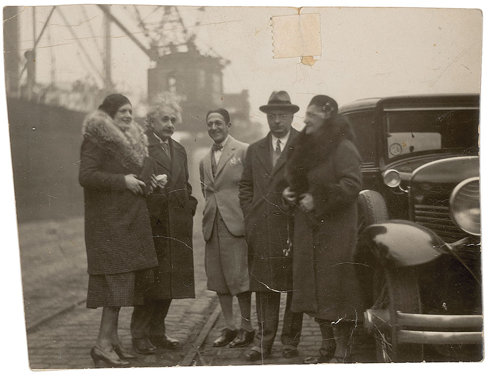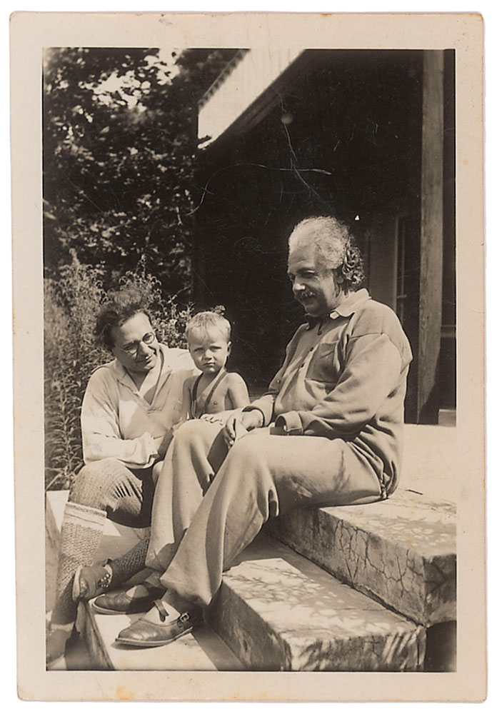 Two small candid photos: a glossy 2 x 3 photo of Einstein sitting on the steps of a house, notated on the reverse in another hand with a date of August 30, 1930, and indicating that it was taken at Caputh, where Einstein kept his summer home; and a glossy 4.5 x 3.25 photo of Einstein, his wife Elsa, and cousins, notated on the reverse in another hand with a date of November 30, 1931, indicating that it shows Einstein departing from Antwerp on his way to California. In overall very good condition, with heavy scattered creases and a small tape-repaired tear to the top of the second photo.