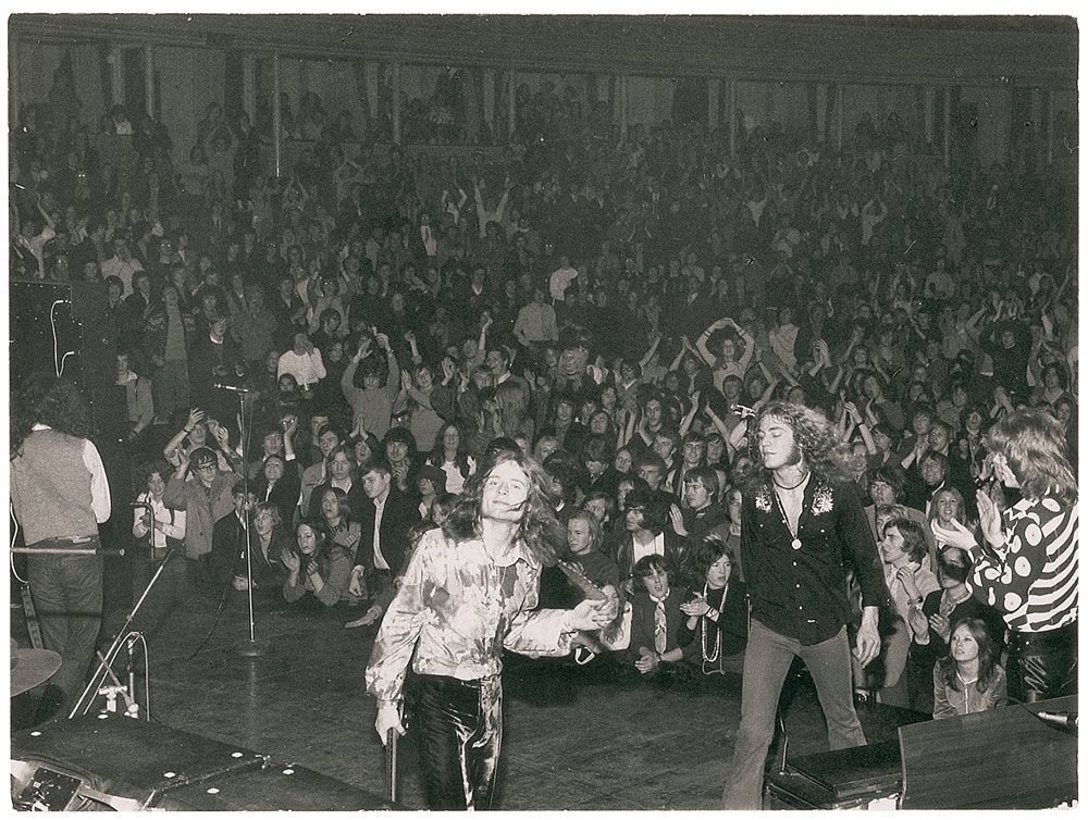 Impressive unsigned vintage semi-glossy 11.75 x 8.75 double-weight Robert Ellis photo of a young Led Zeppelin leaving the stage after a performance in a packed Royal Albert Hall on June 29, 1969. Reverse is affixed with a Robert Ellis copyright label, with a photography stamp underneath. In fine condition, with slight wear to edges and trivial creasing to left side.