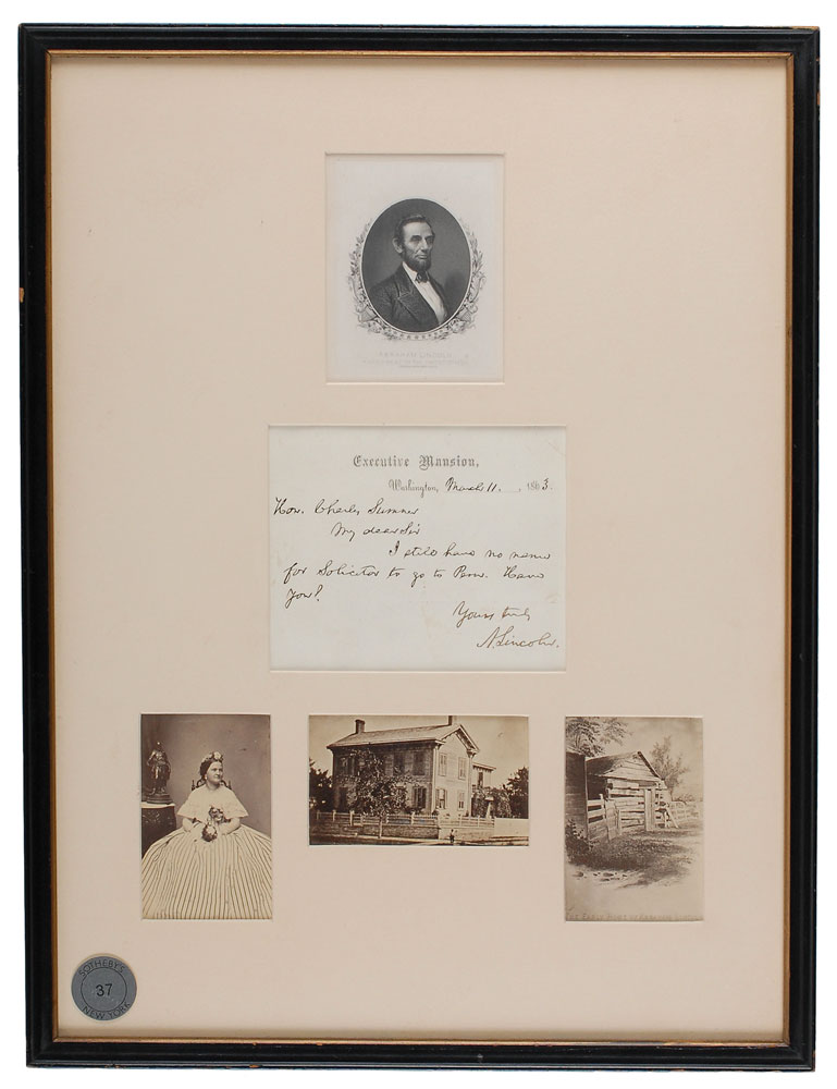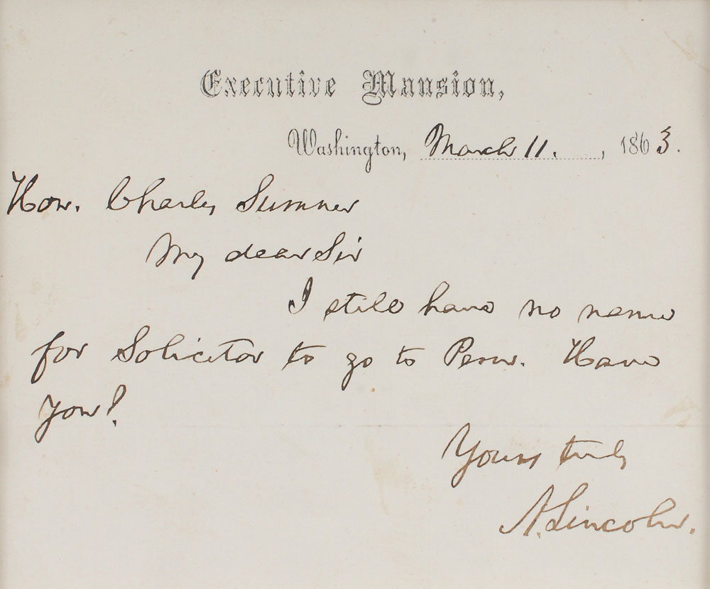 Brief ALS as president, signed “A. Lincoln,” one page, 4.5 x 3.75, Executive Mansion letterhead, March 11, 1863. Brief letter to Senator Charles Sumner. In full: “I still have no name for Solicitor to go to Peru. Have you?” Matted and framed by Goodspeed’s Book Shop with four images to an overall size of 12 x 16. In fine condition. An ardent abolitionist, Charles Sumner was also chairman of the Senate Foreign Relations Committee. A recently approved treaty with the South American country authorized the appointment of a solicitor ‘learned in the Spanish language.’ A desirable piece of correspondence demonstrating Lincoln’s ability to balance the domestic tumult in the Civil War while keeping an eye toward American foreign relations. Pre-certified PSA/DNA.