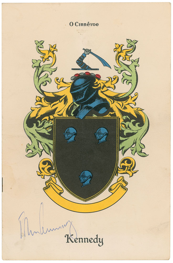 Program from a testimonial dinner given in honor of Senator Kennedy by the Irish Institute of New York City at the Hotel Commodore on January 12, 1957, 6 x 9, four pages, signed on the front cover in blue ballpoint. A central horizontal fold, a few creases, and light scattered soiling, otherwise fine condition. Pre-certified PSA/DNA.