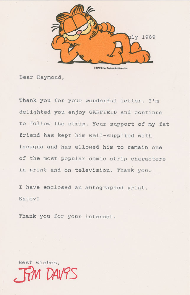 Two items: a TLS, one page, 5.5 x 8.5, Garfield letterhead, July 1989, in part: “I’m delighted you enjoy Garfield and continue to follow the strip. Your support of my fat friend has kept him well-supplied with lasagna and has allowed him to remain one of the most popular comic strip characters in print and on television”; and a felt tip signature, “Thanks! Jim Davis,” on a white 11 x 8.5 cardstock sheet featuring an image of Garfield. In overall fine condition, with slight haloing to the signature. Pre-certified PSA/DNA.