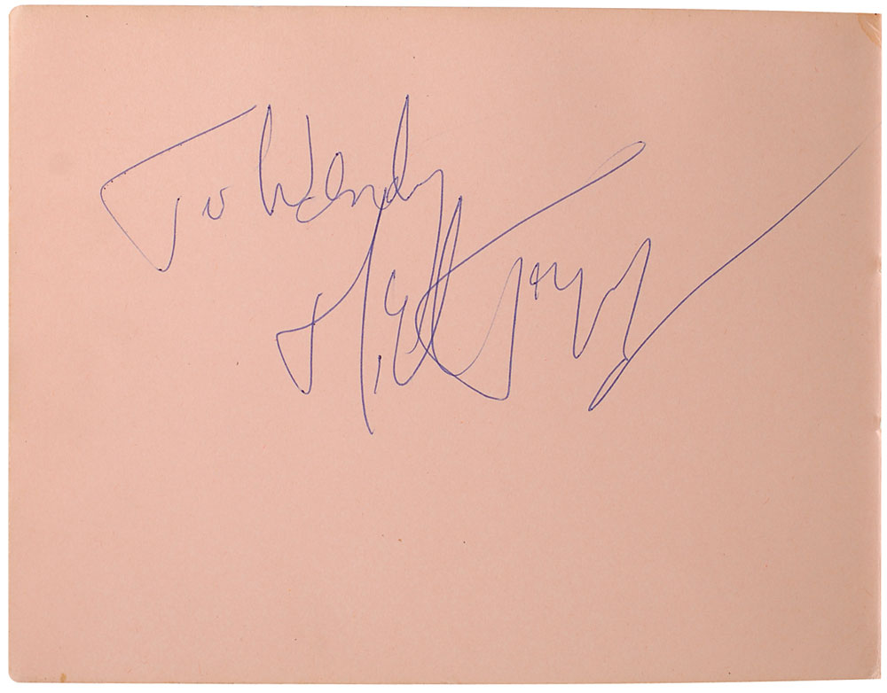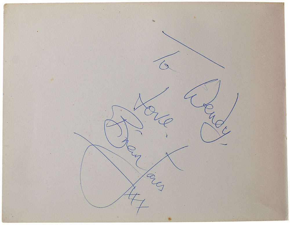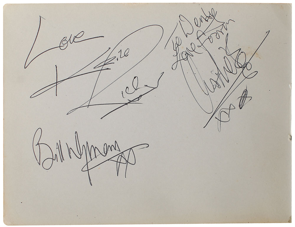 Desirable complete set of vintage circa 1964 ballpoint signatures contained within their original 5.5 x 4.25 autograph album, with one page signed and inscribed, “Love, Keith Richards,” “To Wendy, Love from Charlie Watts,” and “Bill Wyman,” another page signed and inscribed, “To Wendy, love, Brian Jones, xxx,” and a third signed and inscribed, “To Wendy, Mick Jagger.” In fine condition. Pre-certified REAL.