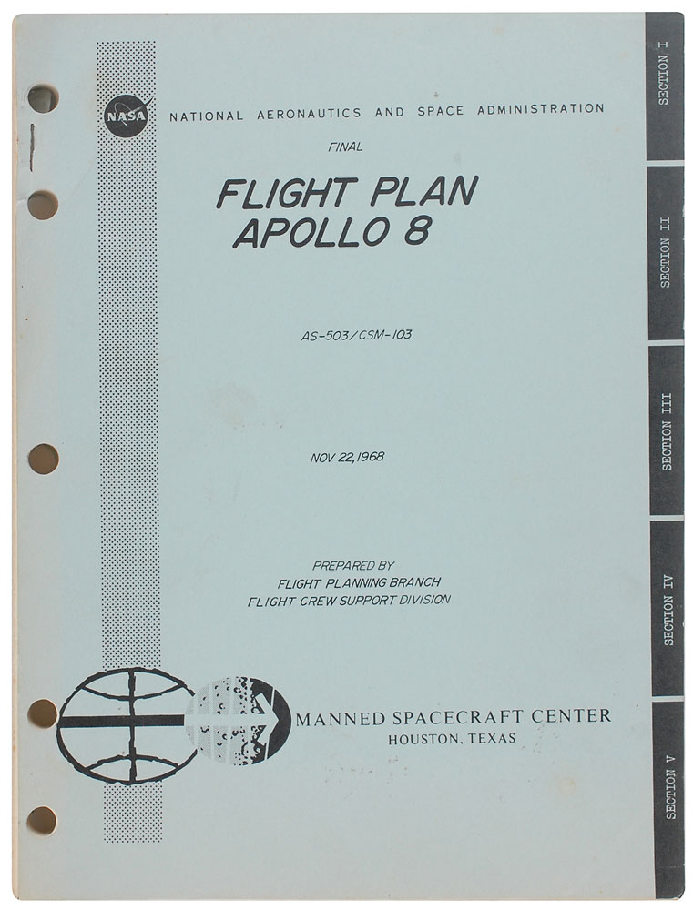 Staple-bound Apollo 8 flight plan manual entitled “Final Flight Plan, Apollo 8, AS-503/CSM-103,” 233 pages, 8 x 10.5, November 22, 1968. The plan provides general notes on the mission, a detailed timeline, consumables analysis, detailed test objectives, and a flight plan summary. Housed in a modern three-ring binder. Light soiling, a few creases, and a tear to one binding hole on the front cover, otherwise fine condition. The Leon Ford Collection.
