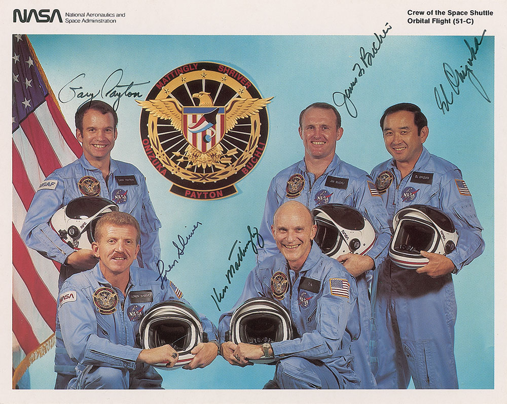 Official color 10 x 8 NASA lithograph of the crew of STS–51–C, signed in black felt tip, “Gary Payton,” “Loren Shriver,” “Ken Mattingly,” “James F. Buchli,” and “El Onizuka.” In fine condition. The Leon Ford Collection. Pre-certified Zarelli Space Authentication.