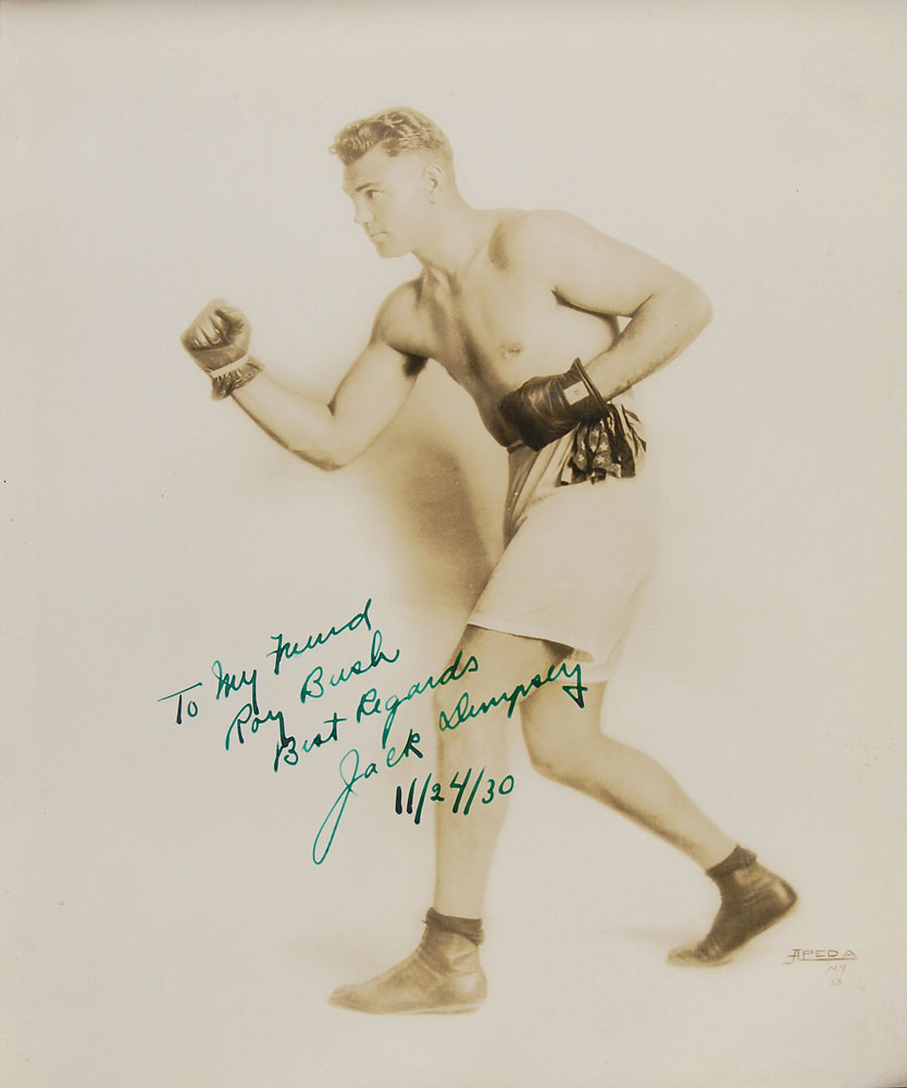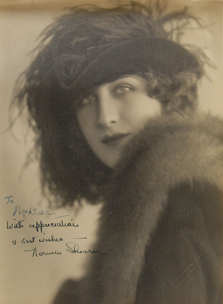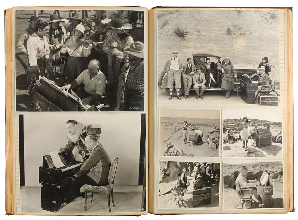 Exceptional scrapbook album owned by Hollywood pianist Melvin Leroy ‘Roy’ Bush, 11 x 16, containing 40 signed photos—the great majority inscribed to “Roy”—and just over 100 fascinating unsigned photos from film sets. The majority of the signed photos measure approximately 8 x 10, with oversized or smaller images indicated in parentheses. Signers include: Norma Shearer, Clara Bow (oversized), Constance Talmadge (oversized), Lilyan Tashman (oversized), Jack Dempsey, Evelyn Brent (oversized), Bobby Agnew, Mary Brian, June Collyer, Philippe De Lacy (5 x 7), Harrison Ford (silent film actor, 1884-1957), Robert Frazer, John Gilbert, Gaston Glass, Elinor Glyn, Neil Hamilton, Frankie Lee, Beatrice Lillie (oversized), Anita Louise, Katherine MacDonald, Harry T. Morey, Conrad Nagel, Miriam Seegar, Pauline Starke, Lewis Stone, Virginia Valli (oversized), Walter Wilkinson, and thirteen others. There is also a large original drawing in the style of George McManus’s ‘Bringing Up Father’ cartoon, signed “Coffey,” showing Bush at his piano. The unsigned photos primarily measure between 9 x 7 and 10 x 8, and show film sets, actors and actresses, and other details of production; many of them include Bush as a subject, generally seated behind his little upright piano. In overall very good to fine condition. Bush was born on August 21, 1889, and was employed by movie studios during the late silent era, building a house in Culver City in 1922. He was evidently close to many of the cast members he worked with, given the warm, friendly inscriptions to him found on the photos in this collection. Combining the classic, rare, and obscure, this is an absolutely unique collection from the early days of cinema.