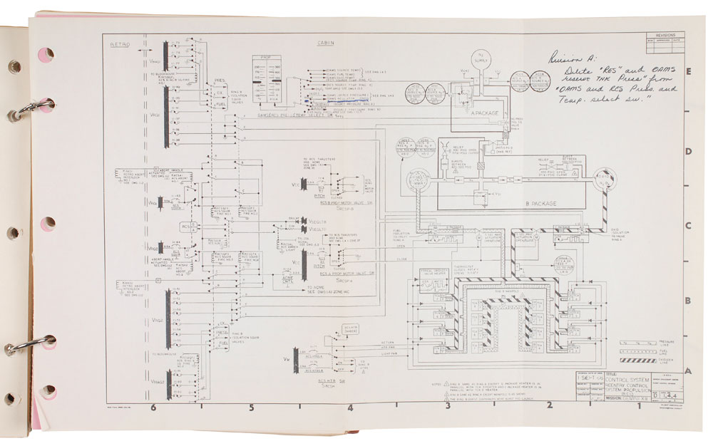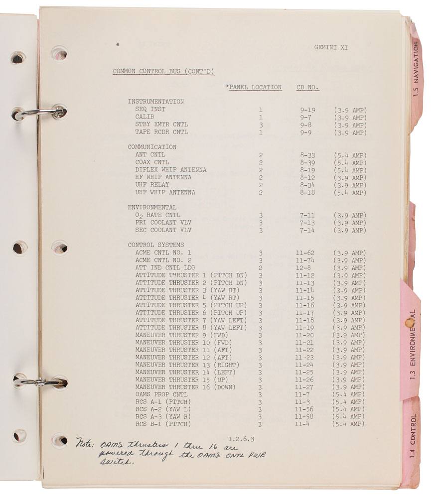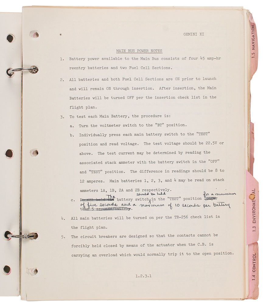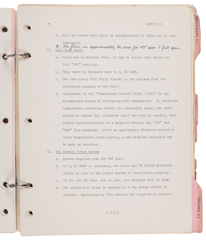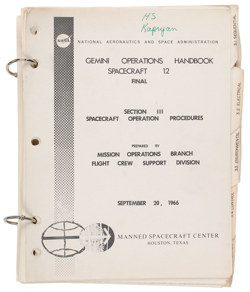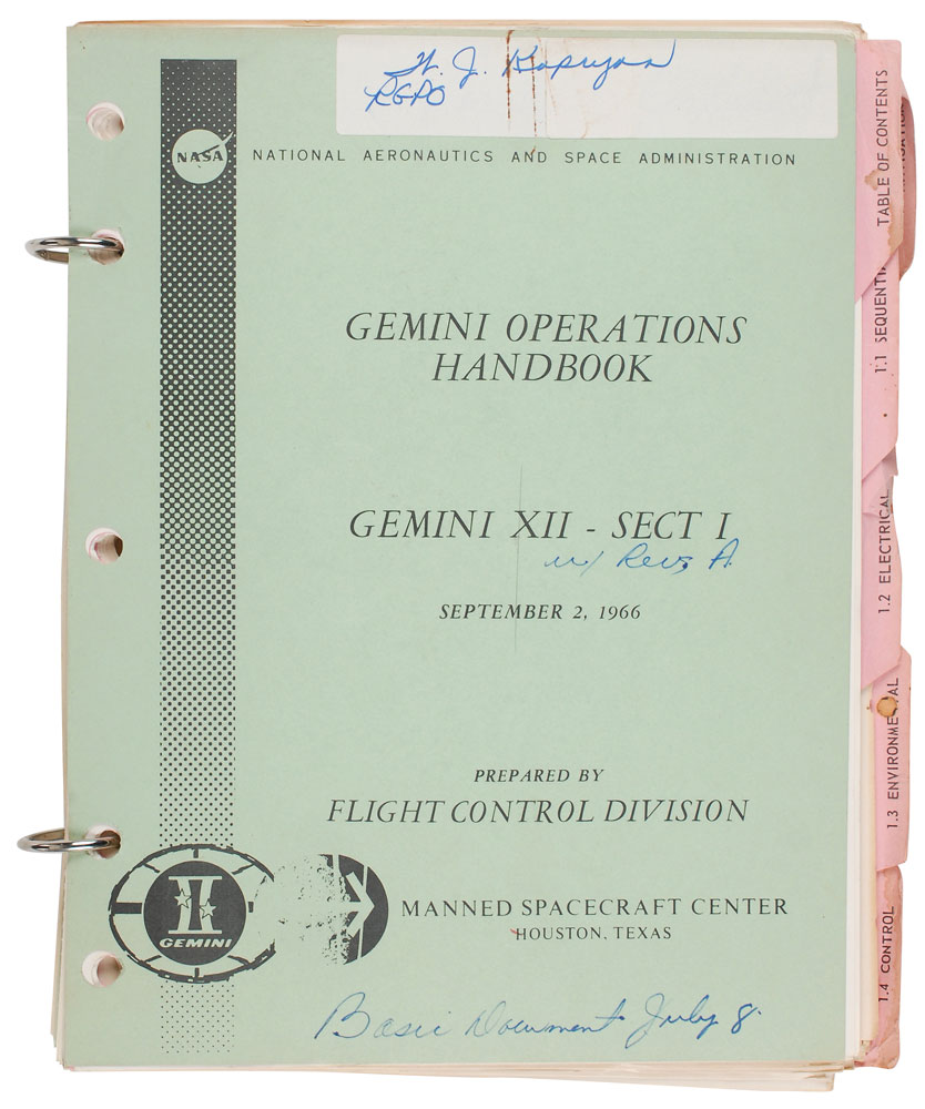 Two Gemini 12 manuals personally-owned and -used by deputy launch director Walter Kapryan. First is his manual entitled “Gemini Operations Handbook, Gemini XII—Sect 1,” to which he has added “w/ Revs A.” Several pages bear notations in Kapryan’s hand, with a couple including: “The flow is approximately the same for 95º open & full open” and “Revision A: Delete ‘RES and OAMS reserve TNK Press’ from ‘OAMS and RCS Press. and Temp. select.” He also strikes through several lines throughout and makes slight revisions to various numbers and measurements. Second is his copy of the final version of the Gemini Operations Handbook, entitled “Section III: Operation Procedures,” not including any annotations inside. Both are housed in modern three-ring binders. In overall fine condition. The Leon Ford Collection.