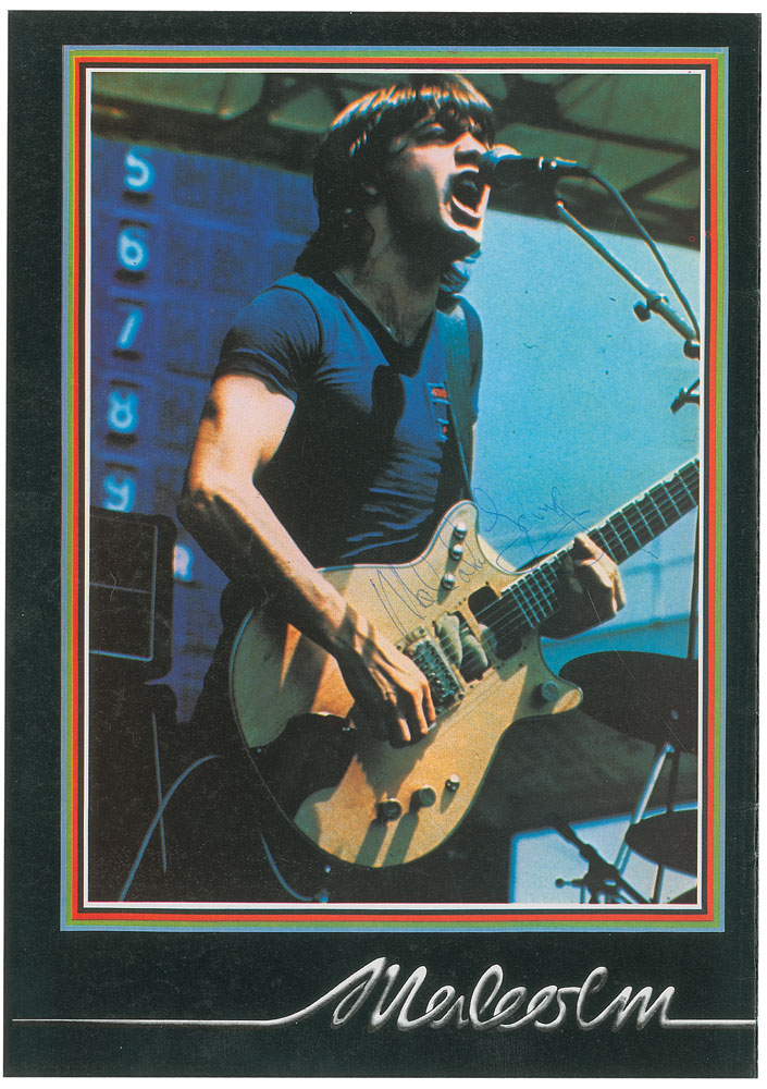 Program for AC/DC’s tour of the United Kingdom in 1978, 8.25 x 11.75, featuring the cover for the band’s first live album If You Want Blood You’ve Got It, signed inside on the individual images of the band in black ballpoint by “Bon, AC/DC,” “Angus Young,” ”Cliff,” and “Phil Rudd,” and in blue ballpoint by “Malcolm Young.” In fine condition, with trivial creasing to covers and moderate contrast to portions of the Angus and Phil signatures against the dark background. Accompanied by a brief letter of provenance from the original recipient stating that he obtained the signatures prior to a 1978 concert at Colchester’s Essex University, a show that was filmed for a BBC program entitled Rock Goes to College. Highlighted by the presence of Scott, this fully signed program captures the band only months removed from the release of their breakthrough album Highway to Hell. Pre-certified REAL.