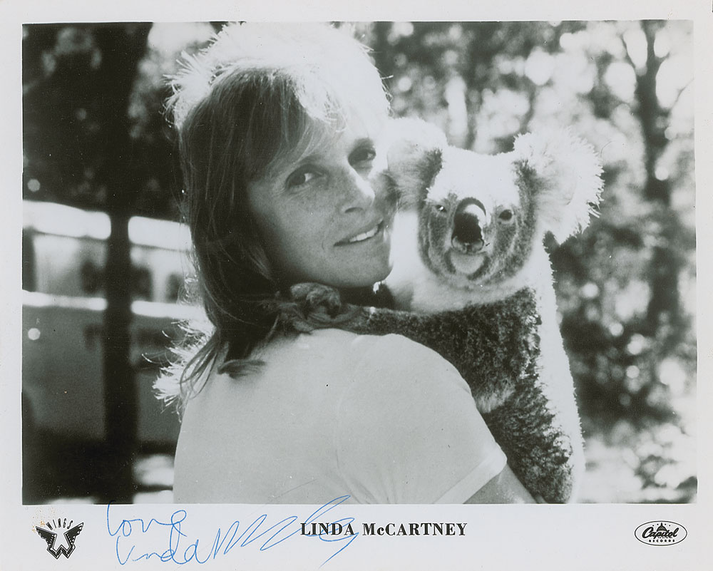 Glossy 10 x 8 Capitol Records Wings publicity photo of McCartney holding a koala, signed in the lower border in blue ballpoint, “Love, Linda McCartney.” In fine condition, with a trivial spot of soiling to lower left corner. Pre-certified REAL.