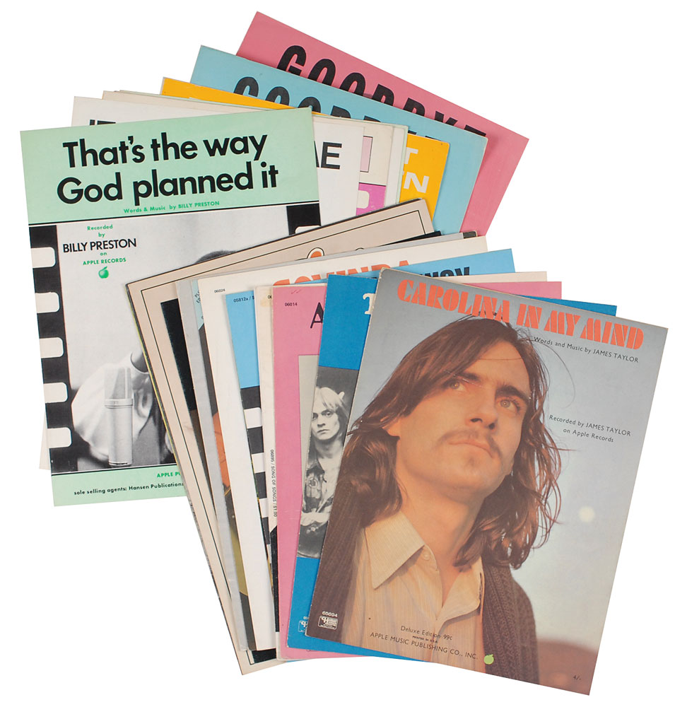 Collection of 25 booklets of sheet music of songs by Apple recording artists, including James Taylor, Trash, Doris Troy, Lon & Derrek Van Eaton, Billy Preston, Mary Hopkin, Elephant’s Memory, and Chris Hodge. Ten are foreign printed and 15 are USA printed. In overall very good to fine condition.