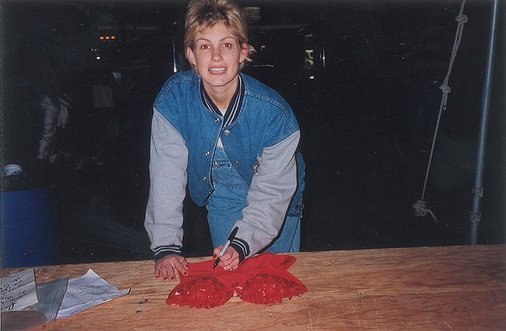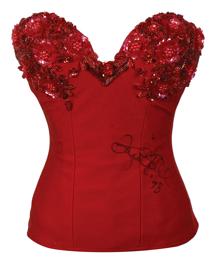Faith Hill’s stage-worn and custom-made red polyester bustier. Adorned along the top with red sequins, and signed on the front in black felt tip, “Faith Hill ’98.” Accompanied by a handwritten letter of provenance on her touring letterhead, which reads, “I wore this one Christmas at the Grand Ole Opry, Faith Hill,” and also accompanied by a photo of Hill signing the bustier. In fine condition, with a few loose sequins. Pre-certified PSA/DNA.