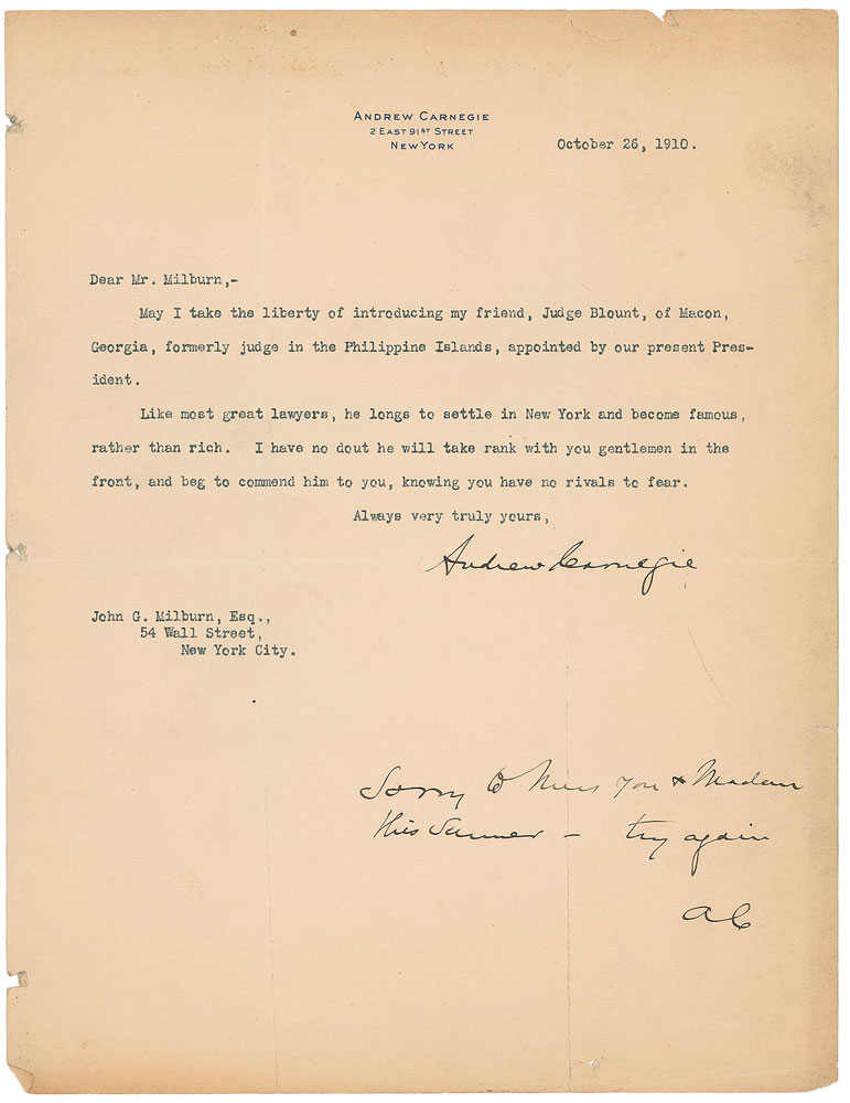 TLS, one page, 8.25 x 10.75, personal letterhead, October 26, 1910. Letter of recommendation to John G. Milburn, a partner at the prestigious law firm Carter Ledyard & Milburn on Wall Street. In full: “May I take the liberty of introducing my friend, Judge Blount, of Macon, Georgia, formerly judge in the Philippines Islands, appointed by our present President. Like most great lawyers, he longs to settle in New York and become famous, rather than rich. I have no doubt he will take rank with you gentlemen in the front, and beg to commend him to you, knowing you have no rivals to fear.” He adds a handwritten postscript below, initialed “AC,” in full: “Sorry to miss you & Madam this summer—try again.” In very good condition, with intersecting folds passing through the signature, overall toning and light soiling, and dings and chips to edges. Pre-certified PSA/DNA.