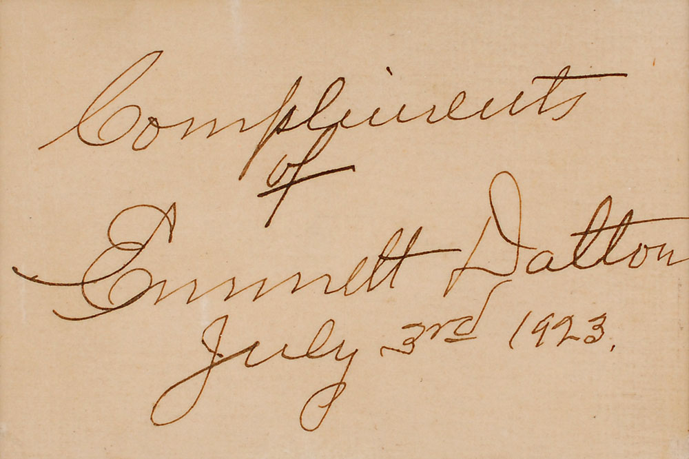 Ink signature, “Compliments of Emmett Dalton, July 3rd 1923,” on an off-white 4 x 2.5 slip. Expertly double-matted and framed to an overall size of 11 x 16.5. In fine condition, with uniform toning. Emmett was the youngest of the brothers that made up the legendary Dalton Gang of the Old West and was sentenced to life in prison after an attempted bank robbery in 1892. He was pardoned fourteen years later and became a reformed, respectable member of society. After moving to California to work in real estate, he also embarked on a career in the arts, capitalizing on his notoriety to publish books and begin a career in Hollywood. Pre-certified PSA/DNA.