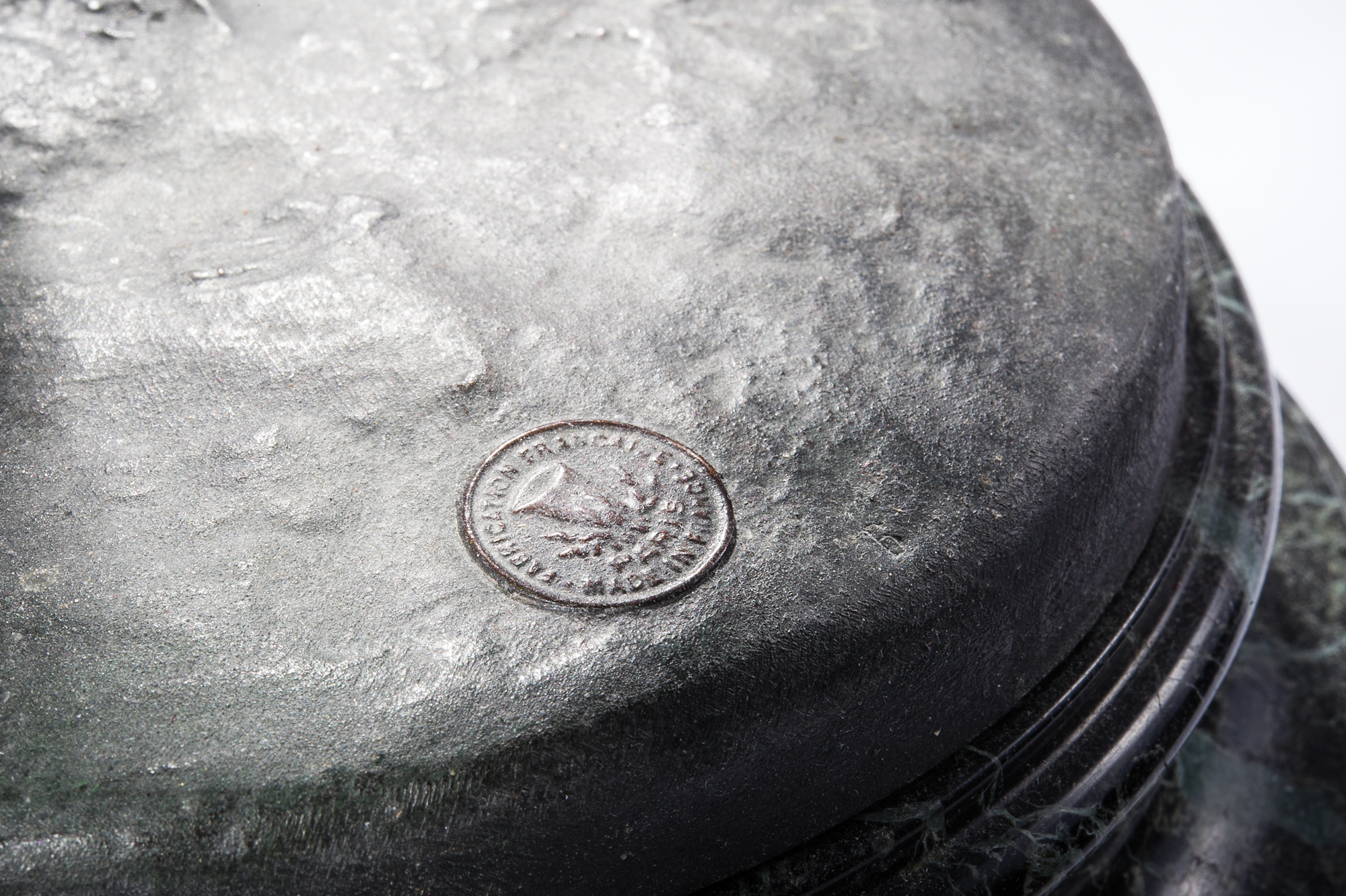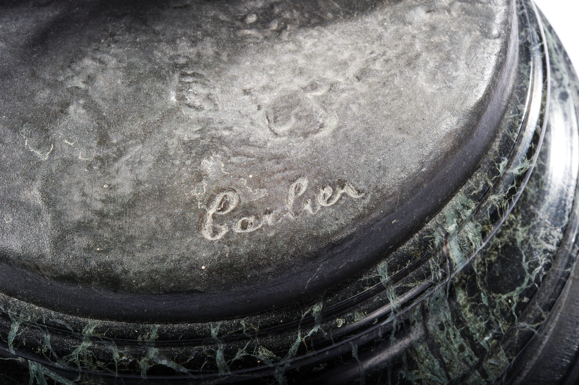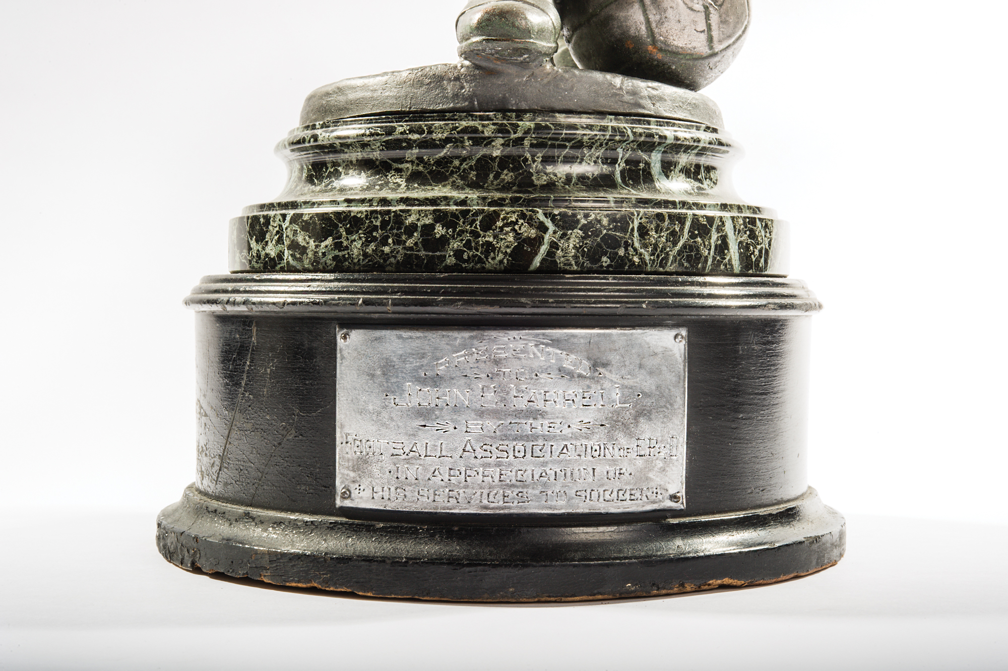 Impressive and very detailed sculpture of a young boy kicking a soccer ball, measuring 26˝ tall on a stunning green marble and wood base. Work is signed in the base, "Carher," and is also stamped, "Made in Paris, France." Black wooden base has a hand-engraved presentation plaque, which reads: "Presented to John B. Farrell by the Football Association of E.P.&D., in appreciation of his services to soccer." In fine condition, with some minor dings and chips to bottom portion of wooden base, but not to the marble or artwork itself. A highly skilled player and an avid promoter of soccer in the United States, Farrell was presented with this beautiful sculpture in the late 1800s. He passed his passion for the sport down to his son, Henry C. Farrell, who went on to play for the 1924 US Olympic soccer team. This sculpture comes from the collection of Raleigh DeGeer Amyx, who received it from John B. Farrell's great-granddaughter, Susan Farrell Beatrice. An expertly crafted and beautifully presented piece of sports history.