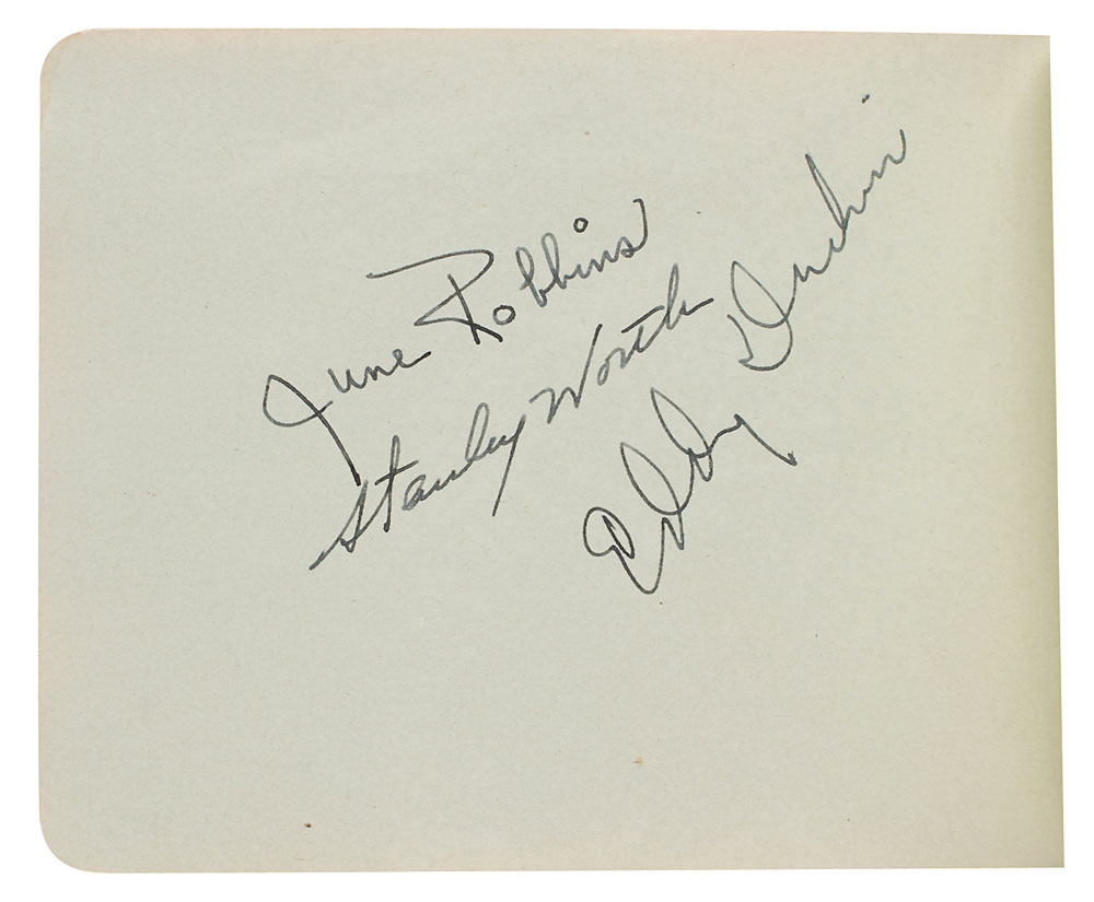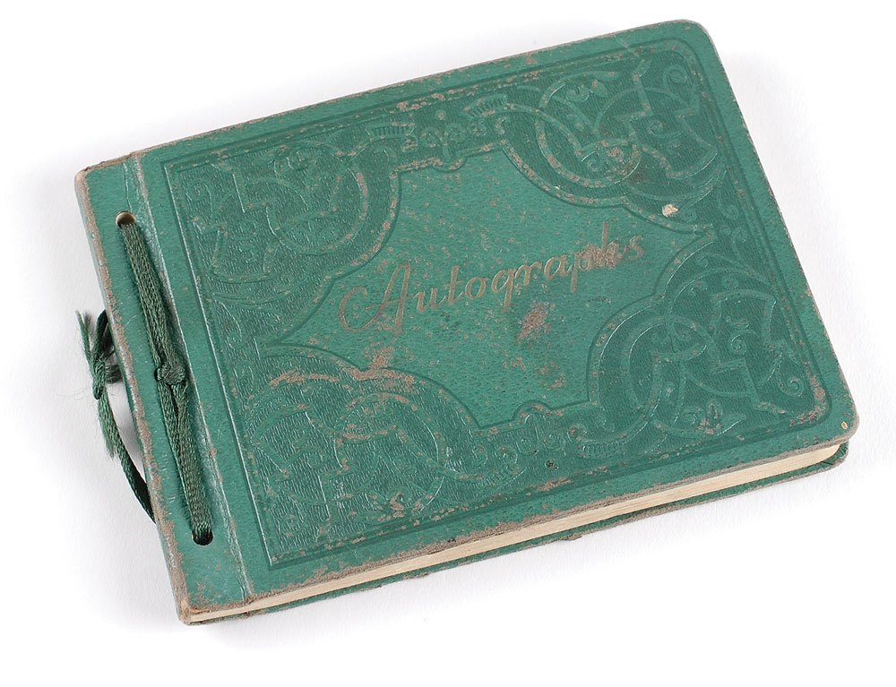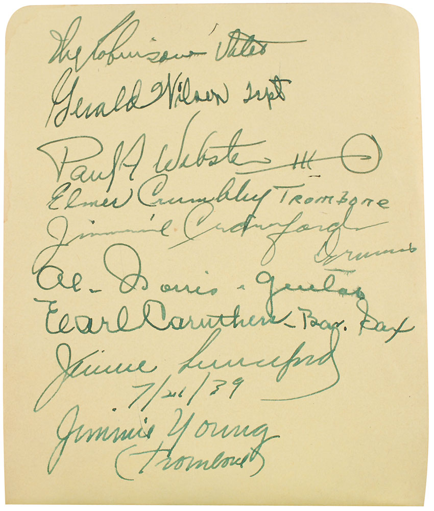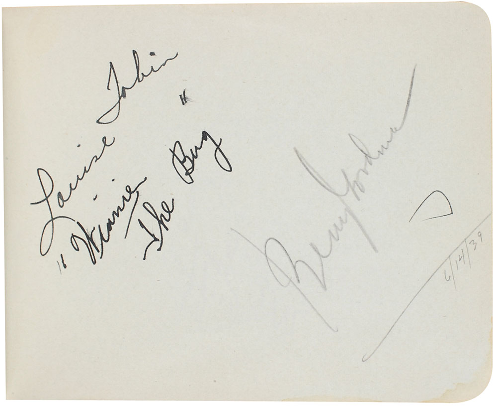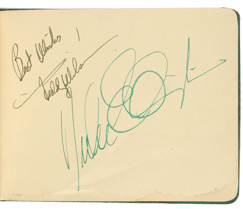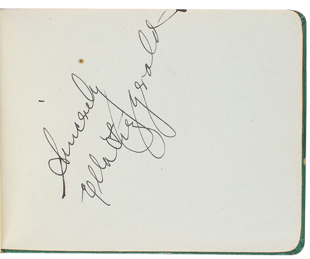 Hardcover autograph book, 6.25 x 4.5, signed inside in mostly fountain pen by approximately 130 big band and jazz musicians, including: Ella Fitzgerald, Duke Ellington, Benny Goodman (pencil), Jimmie Lunceford, and Eddy Duchin. In fine condition with trivial dampstaining to lower right corners on several pages. Pre-certified REAL.