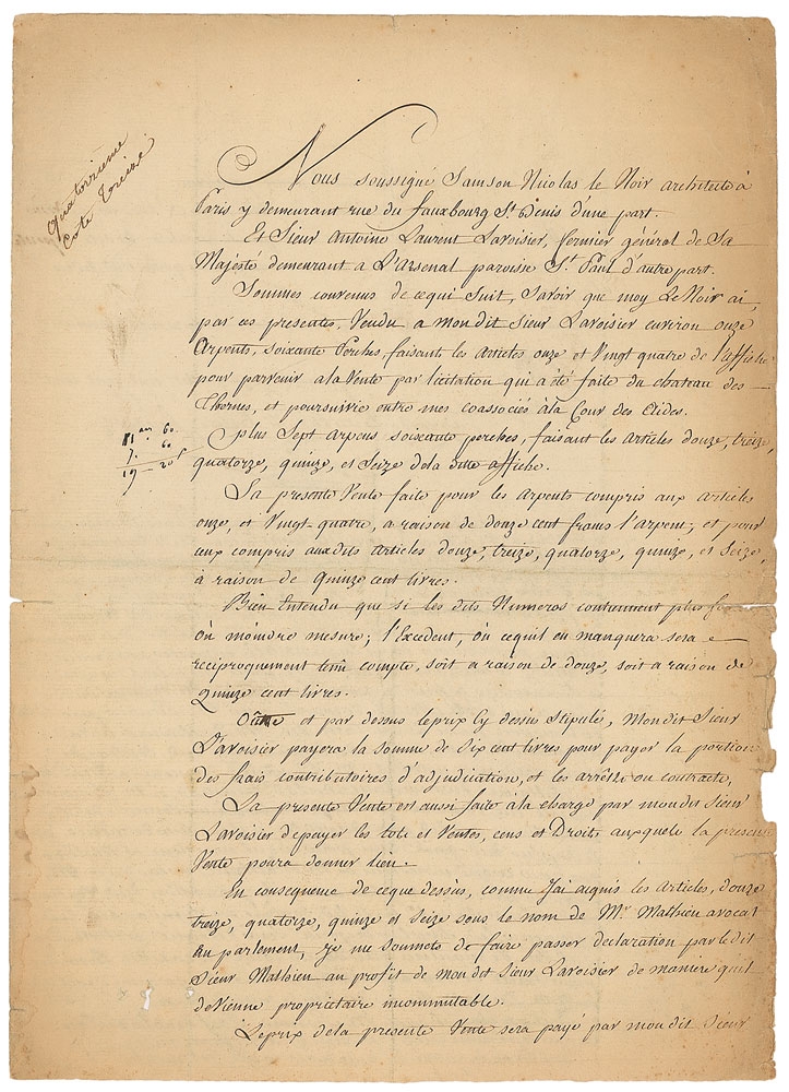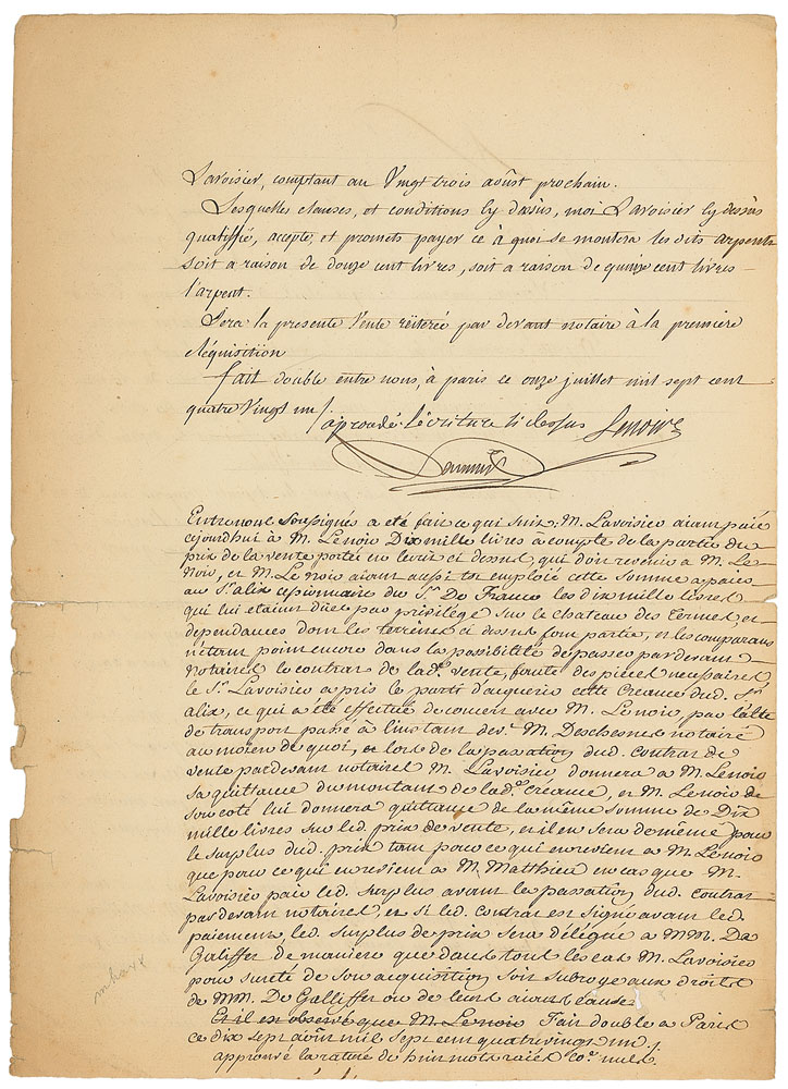 Extremely influential French chemist (1743–1794) noted for his discovery of the role oxygen plays in combustion. Rare manuscript DS in French, signed “Lavoisier,” one page both sides, 9.5 x 13.25, July 11, 1781. Untranslated contract with architect Nicholas Samson Lenoir, including a detailed list of payments to be made and mutual obligations. In very good condition, with central horizontal fold with small edge separations, toning to edges, and scattered small tears and chipping to one edge. Pre-certified PSA/DNA.