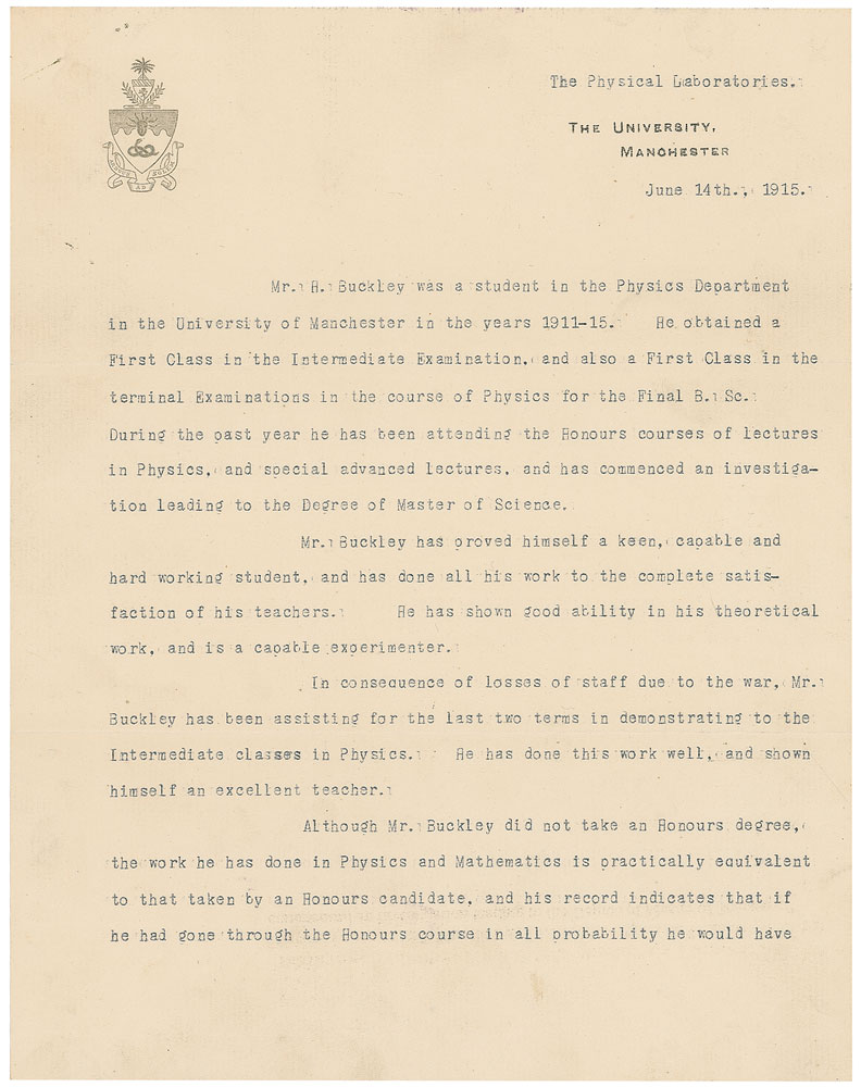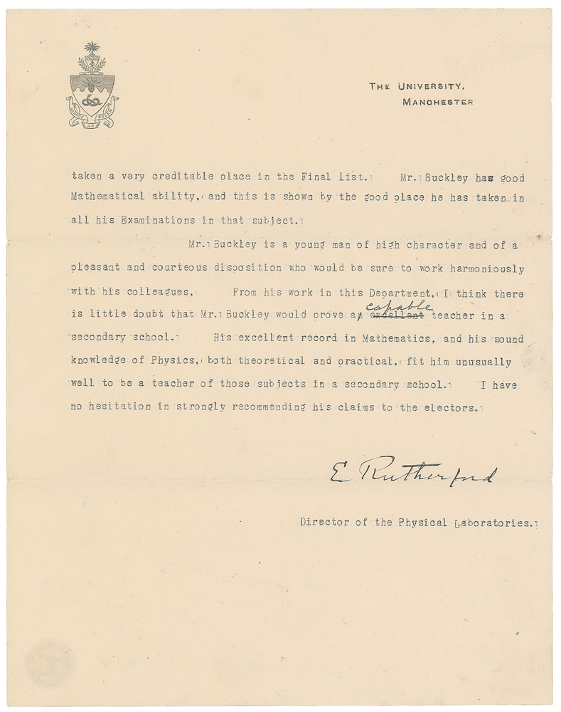 New Zealand-born physicist and chemist (1871–1937) who discovered the concept of radioactive half-life; he was awarded the Nobel Prize in Chemistry in 1908. World War I-dated TLS signed “E. Rutherford,” two pages, 8 x 10.25, The University of Manchester letterhead, June 14, 1915. Letter of recommendation for a student, in part: “Mr. B. Buckley was a student in the Physics Department in the University of Manchester in the years 1911–15…In consequence of losses of staff due to war, Mr. Buckley has been assisting for the last two terms in demonstrating to the Intermediate classes in Physics. He has done this work well, and shown himself an excellent teacher…His excellent record in Mathematics, and his sound knowledge of Physics, both theoretical and practical, fit him unusually well to be a teacher of those subjects in a secondary school.” Rutherford makes a single handwritten emendation to the text. In fine condition, with expected mailing folds (one touching the bottom tips of the signature), trivial dings, and staple holes to upper left corner. Bookended by two of his most famous contributions to science—the formulation of the Rutherford model in 1911 and his successful splitting of the atom in 1917—this was one of Rutherford's most prolific decades as an experimental physicist. Joining the war effort, he shifted his focus towards the detection of submarines in 1915, paving the way for sonar technology. Pre-certified PSA/DNA.