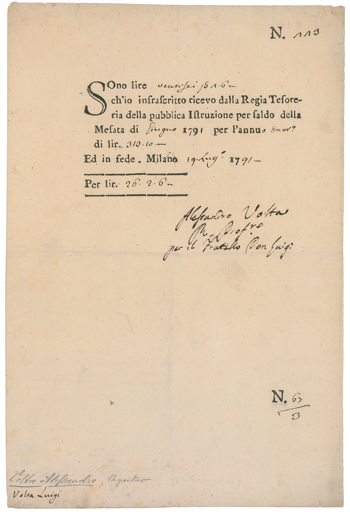 Italian physicist (1745–1827) best known for his epochal investigations into the nature and uses of electricity, leading him to invent the battery. The unit denoting the potential difference or electromotive force was named the volt in his honor. Partly-printed DS, in Italian, one page, 7.5 x 11.25, July 19, 1791. A receipt for Volta’s brother’s fees as a university professor. Intersecting folds and a couple small tears to the top edge, otherwise fine condition. Pre-certified PSA/DNA.
