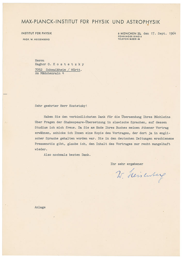 TLS in German, signed “W. Heisenberg,” one page, 8.25 x 11.5, Max Planck Institute for Physics and Astrophysics letterhead, September 17, 1964. Letter to Ukrainian writer and publisher Ihor Kostetsky, in full (translated): “Thank you for sending me your pamphlet about questions of translating Shakespeare into Slavic languages. I am looking forward to reading it. Since at the end of your letter you mention my Athens presentation, I am sending you a copy of the presentation, which was given in English. The write-up in the German papers, to my mind, is flawed in its presentation of the content of the presentation.” In fine condition. On June 3, 1964, Heisenberg delivered a lecture titled 'Natural Law and the Structure of Matter' before a distinguished crowd at the Greek Hill of Pynx in Athens; it was published shortly thereafter in Frontiers of Modern Scientific Philosophy and Humanism. Pre-certified PSA/DNA.