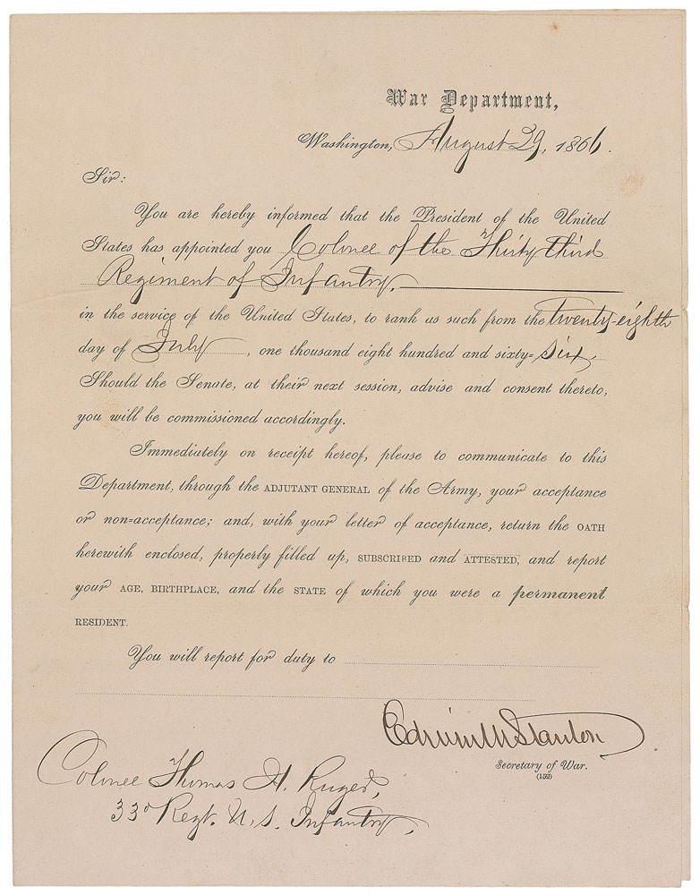 Partly-printed DS, one page, 8 x 10.25, August 29, 1866. Secretary of War Stanton issues a promotion to Thomas H. Ruger. In part: “You are hereby informed that the President of the United States has appointed you Colonel of the Thirty third Regiment of Infantry in the service of the United States.” In fine condition, with expected document wear. Pre-certified PSA/DNA.