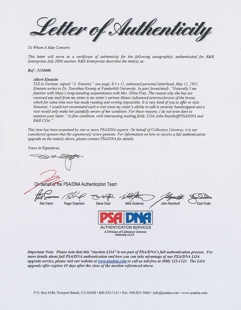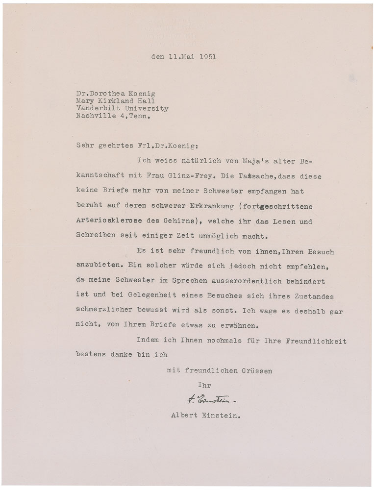 TLS in German, signed “A. Einstein,” one page, 8.5 x 11, personal letterhead, May 11, 1951. Letter to Dorothea Koenig, in part (translated): “Of course I know of Maja's old acquaintance with Mrs. Glinz-Frey. The fact that she has not received any more letters from my sister is due to her severe illness (advanced arteriosclerosis of the brain), which makes her reading and writing for some time impossible. It's very kind of you to offer your visit. [I] would not recommend it because my sister is extremely impeded in speaking, and on occasion of a visit [she is] painfully more aware of her condition than usual. I dare therefore not to mention your letters.” In fine condition, with intersecting folds. Accompanied by a full letter of authenticity from PSA/DNA.