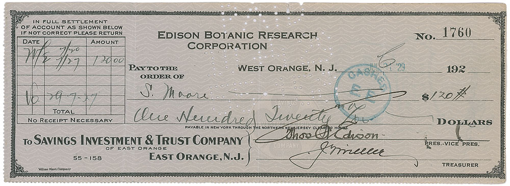 Edison Botanical Research Corporation business check, 8.5 x 3, filled out in another hand and signed by Edison with his prominent ‘umbrella’ signature, “Thos A. Edison,” payable to S. Moore for $120, July 31, 1931. In fine condition, with three vertical folds, a small tear to top edge, and expected bank stamps and cancellation holes. Pre-certified PSA/DNA.