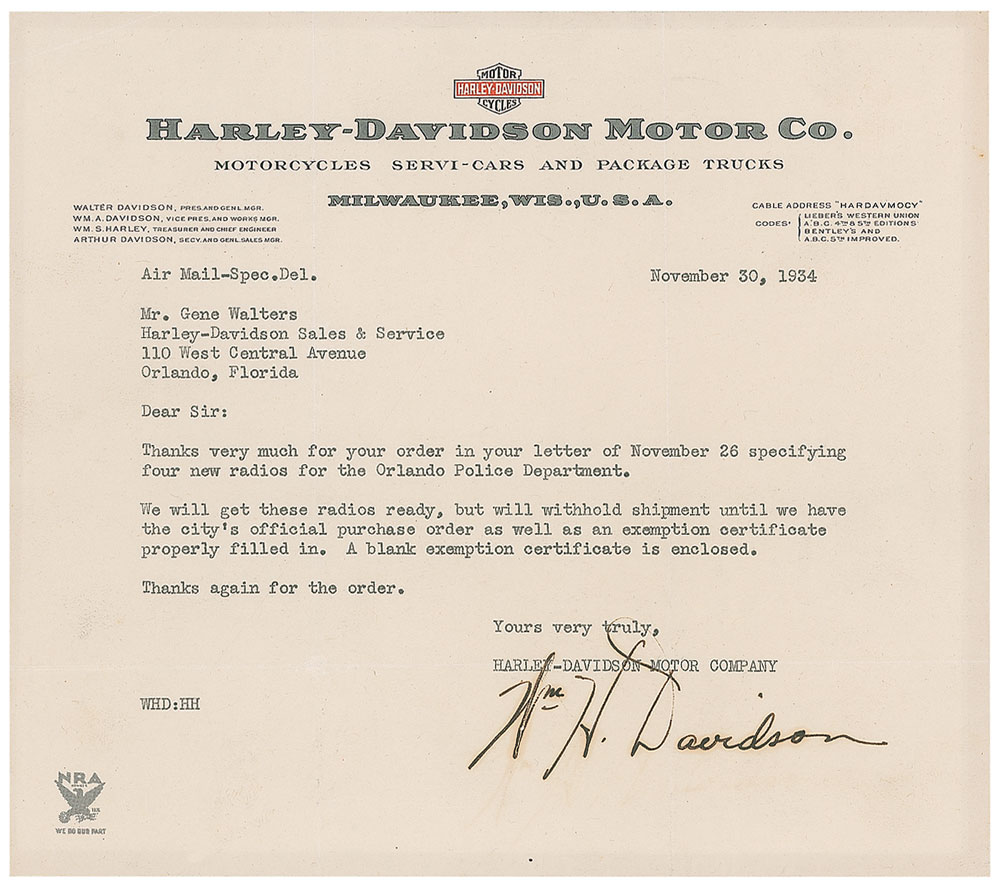 The son of Harley-Davidson Motor Company co-founder Arthur Davidson (1905–1992), who served as the company’s president for 29 years and raced on their behalf, winning the prestigious Jack Pine Trophy in 1929. TLS signed “Wm. H. Davidson,” one page, 8.5 x 7.5, Harley-Davidson Motor Company letterhead, November 30, 1934. Letter to a Florida agent regarding an order of radios for the Orlando, Florida Police Department, in part, “Thanks very much for your order in your letter of November 26 specifying four new radios for the Orlando Police Department. We will get these radios ready, but will withhold shipment until we have the city’s official purchase order as well as an exemption certificate properly filled in. A blank exemption certificate is enclosed.” Intersecting folds, trivial haloing to the signature, and a thin area of ink erosion to the ‘W,’ otherwise fine condition. Pre-certified PSA/DNA.