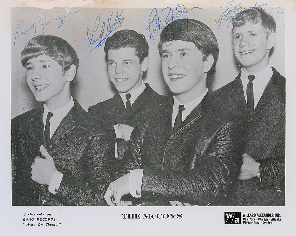 Indiana rock group best known for their 1965 single ‘Hang On Sloopy.’ Uncommon glossy 10 x 8 Willard Alexander publicity photo of The McCoys, signed in blue ballpoint by Rick Zehringer, Randy Zehringer, Ronnie Brandon, and Randy Jo Hobbs. In very good condition, with dampstaining and surface loss to upper portion (affecting portions of the signatures). Originates from the collection of record producer and entertainer Timothy D. Kehr. Pre-certified REAL.