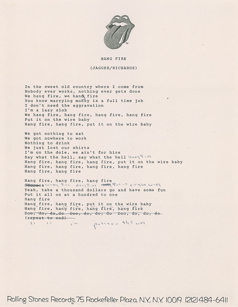 Typed lyrics for ‘Hang Fire,’ one page, 8.5 x 11, copied Rolling Stones letterhead, circa 1981. Jagger corrected the lyrics in his own hand, adding “Hang Fire” three times and “Put it on the wire” twice, as well as crossing out a few lines and correcting a typo. In fine condition, with a few mild creases. These lyrics were originally typed out by an assistant to use in the production of liner notes for Tattoo You; Jagger then corrected any mistakes. Original Rolling Stones lyrics are extremely rare and only a handful have come to market. Pre-certified REAL.
